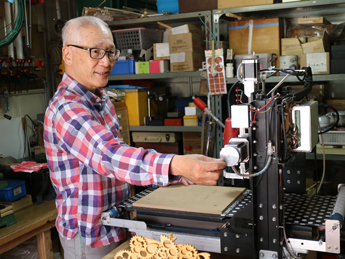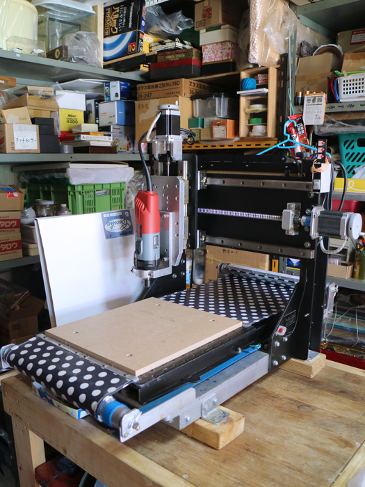 これはParadiseさんの自作CNC。とても素晴らしいのが水玉模様のカバー。ベルトコンベアのような構造になっており、Y軸の動きに連動してカバーが動くようになっている。動力なしで防塵ができるのは魅力だ。加工テーブルにはMDFの板が取り付けられているが、これは材料の固定を貼り付けではなくネジ止めで行うためだ。ネジ止めで材料の固定を繰り返しているとMDFがネジ穴だらけになるが、そうなった場合は交換するそうだ。MDFは安価なので気兼ねなく交換できる。Paradiseさんの作品の多くはこの自作CNCから生まれている。