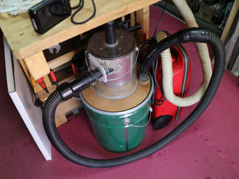 右下の写真は集塵機。むかしの掃除機なのだそうだが、切りくずは掃除機には溜まらず98%は緑色のペール缶に溜まるため紙パックを交換する必要がほとんどないそうだ。とても役に立っているという。
