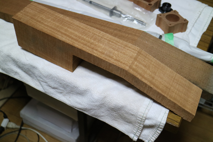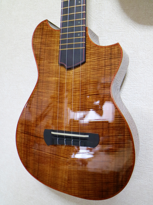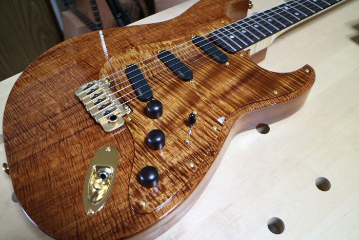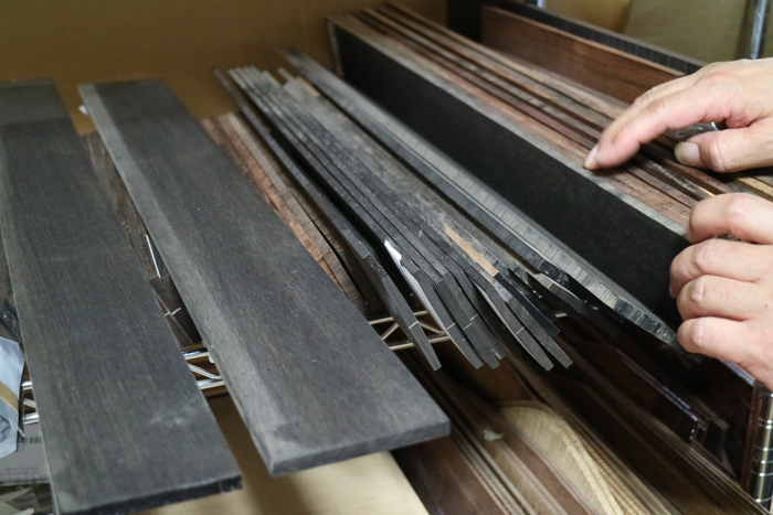 尾伊端さんがこだわっているのはボディー材だけではない。ネック材にはホンジュラスマホガニー、指板にはマダガスカルエボニーを使用するなど現在入手できうる最高品質の素材を使っている。