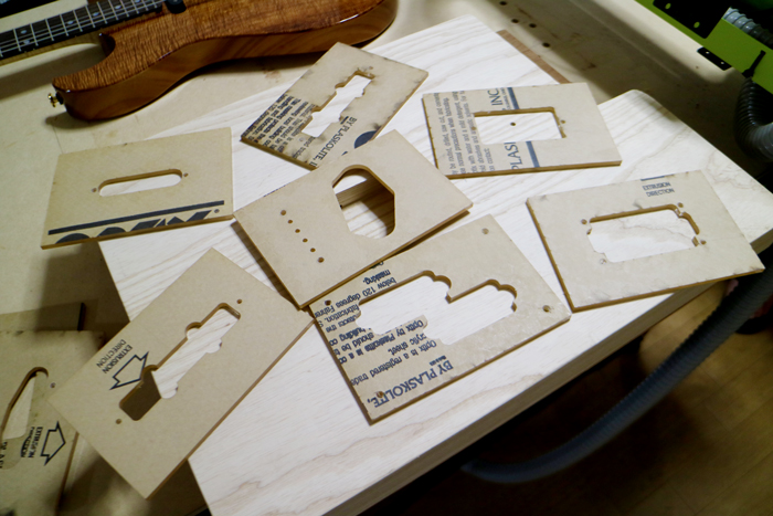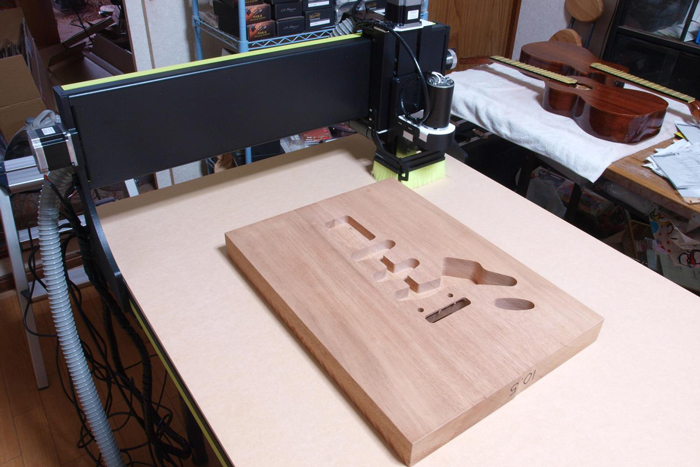 手作業によるエレキギターの加工の場合などは、上の写真にあるようなアクリル製のテンプレートを使い、ルーターをそれに倣わせて加工するそうだ。手作業は段取りに時間がかからないので手っ取り早いというメリットがあるが、作業中はずっと集中していないとならない上に、危険が伴うし、同じものを切削するときには正確性を欠く。そこで尾伊端さんは以前からCNCを導入したいと思っていた。しかしそれにはいくつか気がかりな点があった。