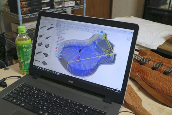 それは、たとえばエレキギターの「ネック」をCNCで削り出す場合、無駄に時間がかからないように、バンドソーで大まかな形状に切断しておいて、そこからCNCで詳細形状を作っていくという方法をとる。しかしそれは高機能なCAMソフトがなければ実現できない。また、木材の加工においては、ツールパス(エンドミルの送り方向)を自由に細かく指定できることが重要で、それがなければ、時間がかかるばかりではなく「ささくれ」がたくさんできてしまい後処理も大変になってしまう。しかしそれは数百万円ほどする高機能なCAMソフトがなければ実現することができない。
