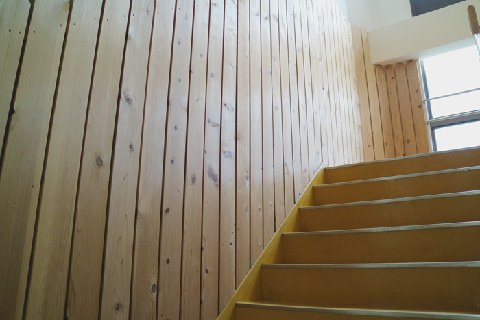 会社の階段には無垢の木材を使用した自作の壁面が作成されており、地元の木材に対する愛情を感じることもできた。