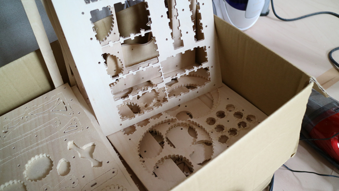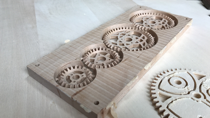 当社のKitMillは、糸鋸などでは加工しにくい立体的な形状の部品や、金属の加工にはもってこいだ。けれども、完吾さんは平歯車のような単なる切り抜きにも活用してくれていた。どんなに糸鋸に慣れていても細かい歯の形状まで糸鋸でつくるのは、さすがの完吾さんでも骨が折れるのかもしれない。書き時計のような素晴らしい作品に、製品が少しでも活用されていることは当社にとっては本当に嬉しいことなのだ。