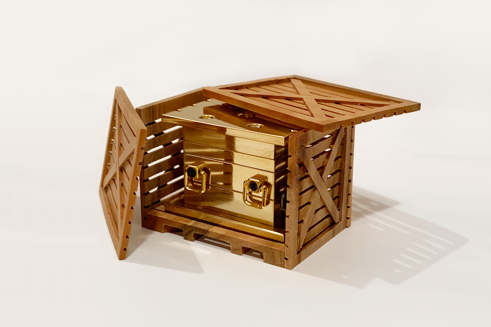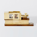 射出成形機とは、取り付けられた金型に溶融した樹脂を高圧で充填する機械のこと。日常目にするプラスチック用品のほとんどがこの射出成形機で作られている。本来、油にまみれた約850tもある巨大な機械が、1/48スケールというミニチュアサイズと、美しい真鍮製のボディで再現されている。実際の成形はできないものの、金型の開閉や型締め力の構造に、実物同様トグル式を採用するなど、金型設計士として実際の成形現場に従事する内田さんならではの細やかな視点が光る作品。
