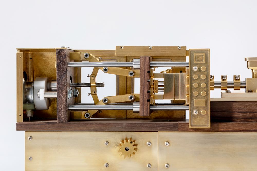 構造をなるべく実物に似せて作りました。型を動かす動力も本物同様トグル式にしてあります。唯一、失敗したところはトグル式にしたことで動作が遅くなってしまったことです。もっと性能の良いステッピングモーターを使えばよかったかなと思ってますね。