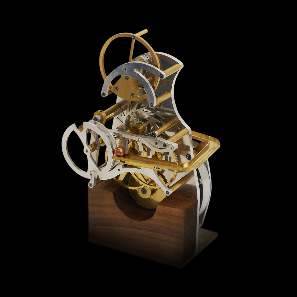 真壁 友『時の可視化』 機械式時計で使われるクラブツース脱進機を使い、ゼンマイ動力で動く機械美の光る立体彫刻作品。機構に必要なガンギ歯車、アンクル、ヒゲゼンマイ等、全て自作部品で制作されている。ものづくり文化展2012 オリジナルマインド大賞受賞作品。