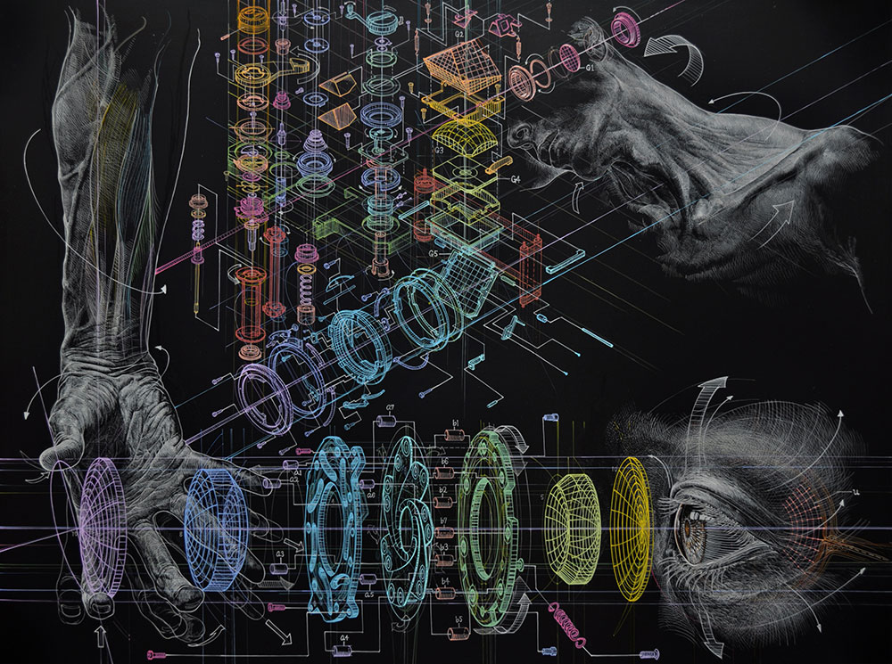 純粋に、機械のことを考えたり描いたりするのが楽しいんです。美術の勉強をした時に、人間の体もまた筋肉や血管、臓器など、機械と同じくいろいろなパーツで構成されていることに気付かされました。一方で現代では、眼鏡をかけたり、車を運転したりするのが当たり前のように、機械は人間の力の延長として欠かせない存在になっている。体の働きを機械へ置き換えるその関係性を、筋肉のパーツや機械部品を描き込むことで表現しようとしています。