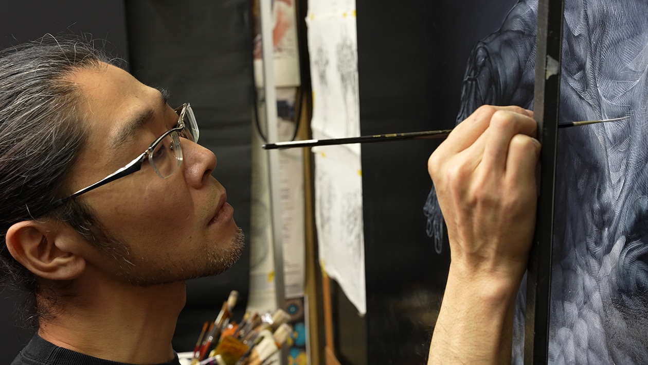 作品の制作風景より。人体の表現や描画マシンが刻んだ線などを油彩の技法で丹念に描き込んでいく。