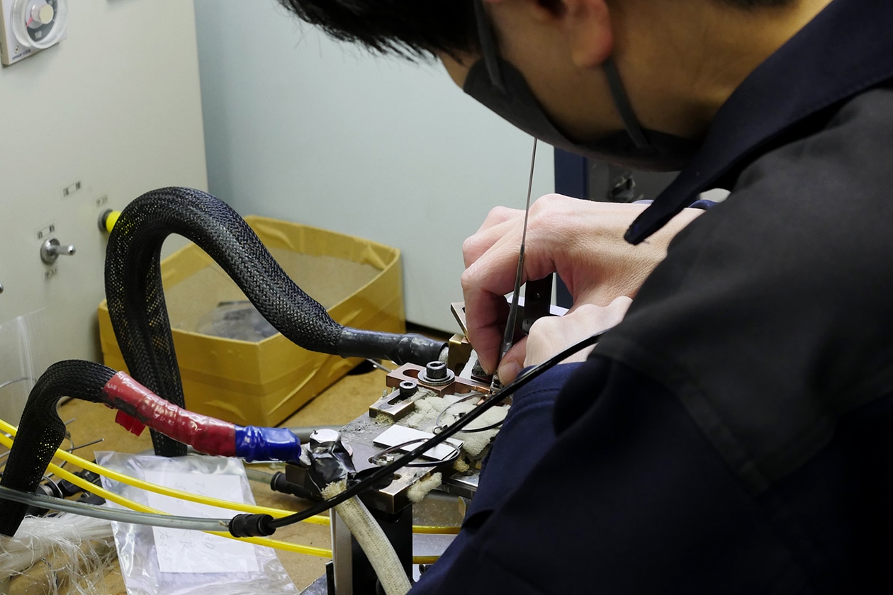 自社開発した機械を使ったロウ付けの工程。ロウ付け跡がなめらかな美しいフレームが生まれる