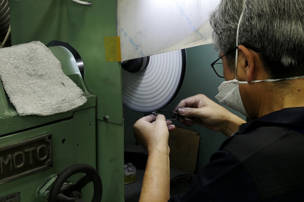 生産の工程も、感覚に頼る部分ばかりです。ロウ付けはロウ材が熱で溶けた色を見ながらつくりますし、治具と部品は0.1mmほどあそびを持たせていて、どうくっつけるかは感覚となります。フレームを顔にフィットさせるためのカーブは、最終検査の工程で手で曲げています。基準や図面はあるのですが、図面通りに曲げればよいわけではなく、そもそも「こんなかけ心地が良い」と言ったような「良い眼鏡の感覚」を持っていないとできないんです。
