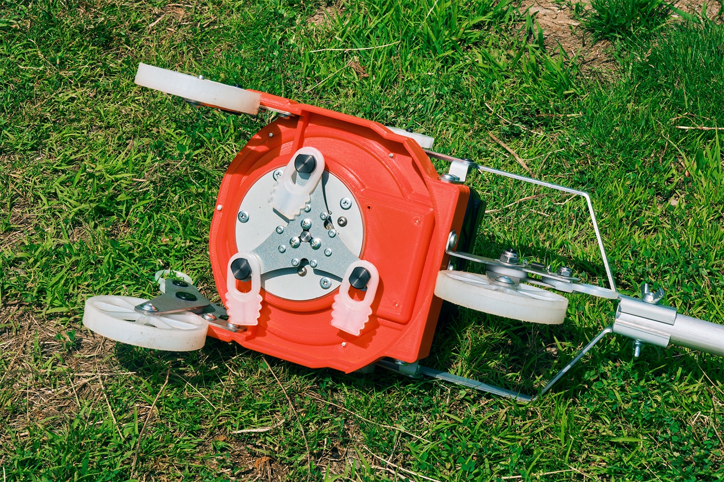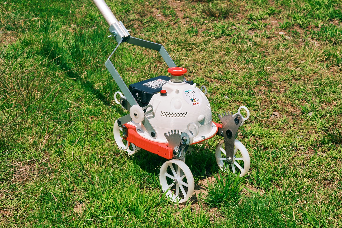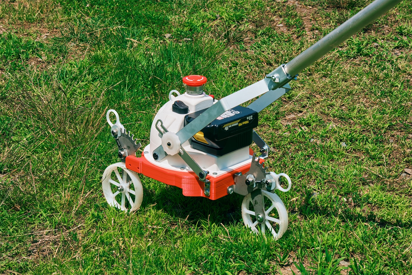 新製品の「刈るルン ゆきちゃん」。高さを段階的に調整するためのリング部分や、ハンドルの角度を調整するノブ、車輪を「空圧式 INARI P35」で製作。