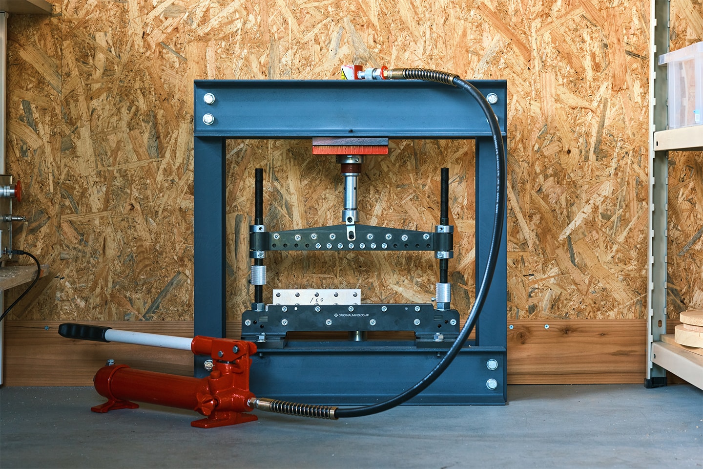新倉庫の片隅で次の出番を待つ、魔改造された「MAGEMAGE」の前モデル「Bender Black 30」。動力源を手動式から油圧式にしたことで、さらに厚い板や幅の広い板を曲げることが可能になっている。