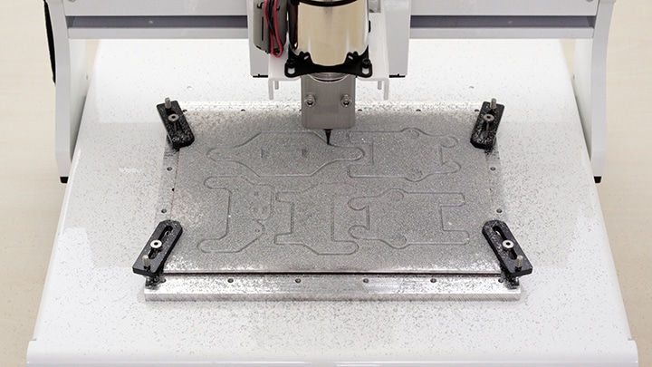 1-1|各部品のサイズに合わせたアルミ板を固定します。原点を設定し加工を開始します。「KitMill」の詳しい使い方はこちらからご覧いただけます。