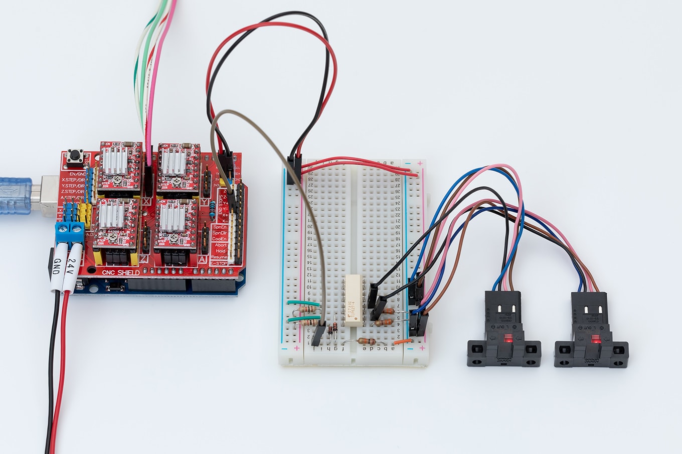 オムロンのフォトマイクロセンサの電源電圧は5~24Vと動作範囲が広いので、電源はCNCシールドの5V端子に接続してもよいですし、24Vに接続してもよいと思います。ただ、5V端子に接続した場合、注意が必要な時があります。それは、Arduino基板のDCジャックに外部電源を接続していない時に、フォトマイクロセンサの数が多くなると、5Vの消費電流が増え、USBから供給される電力では賄いきれない可能性があります。そうなると正常に原点復帰ができません。なので、フォトマイクロセンサの数が多い場合は、Arduino基板のDCジャックに外部電源を接続するか、24Vに接続するのがよいと思います。