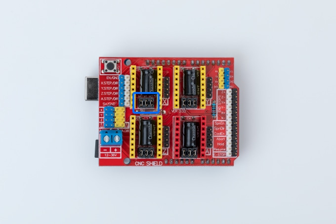CNCシールドに搭載されているドライバモジュールは、そのマイクロステップ駆動に対応しており、ステップ角を最大で1/16まで細かくすることができます。