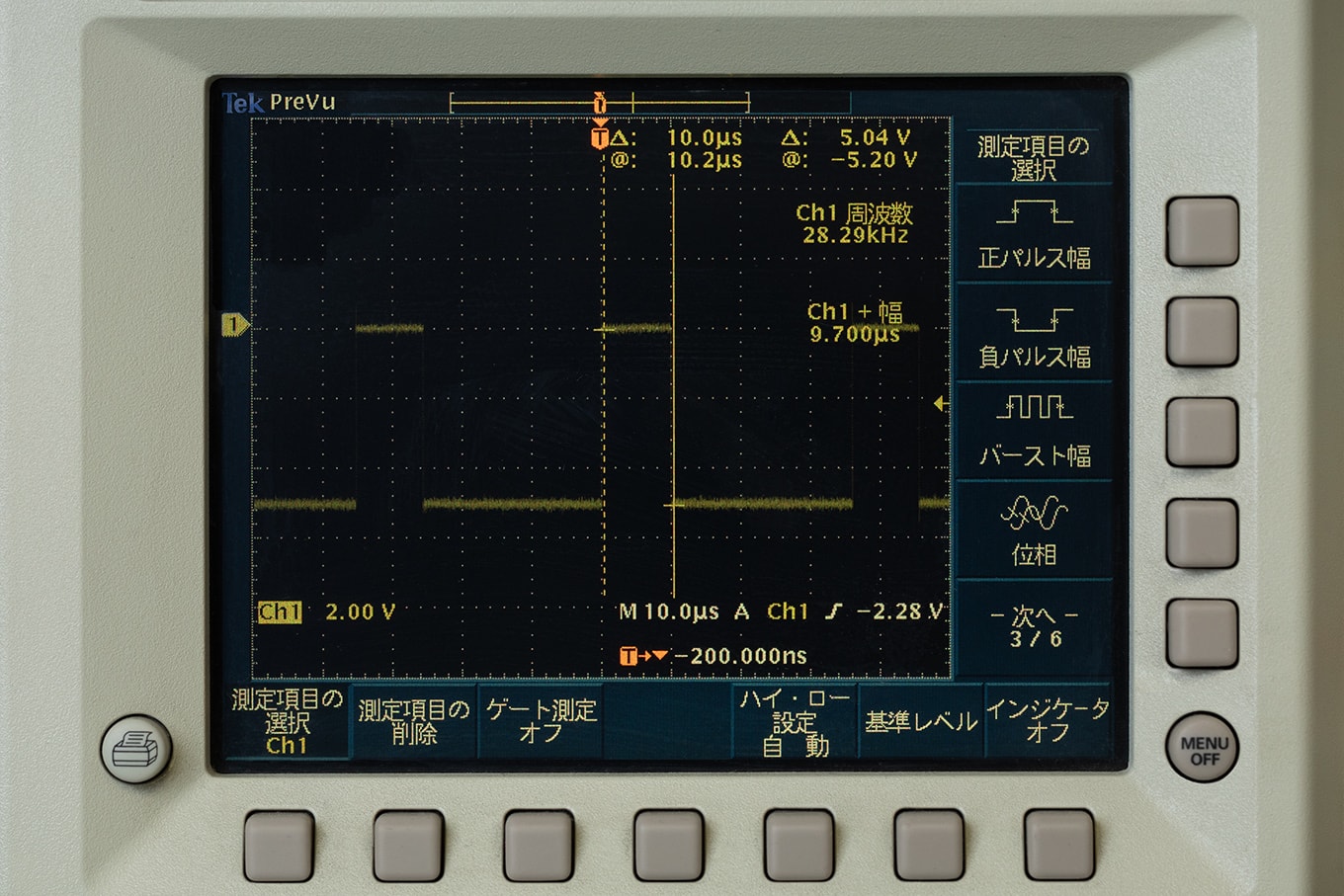 Arduinoから出力されるパルス幅は、出力周波数に関係なく固定されています。そして、そのパルス幅は、デフォルトで10μsとなっています。この10μsというパルス幅は、ドライバによってはフォトカプラのスイッチングが追い付かず、正常に応答できない可能性があります。