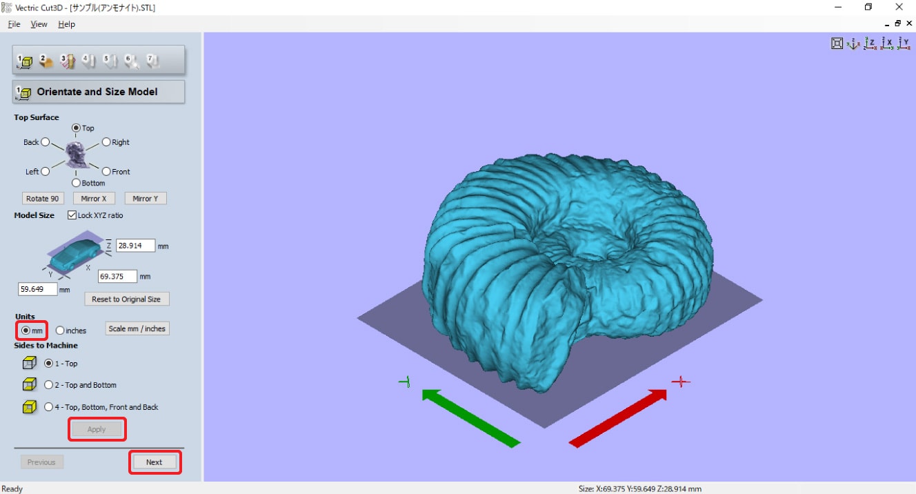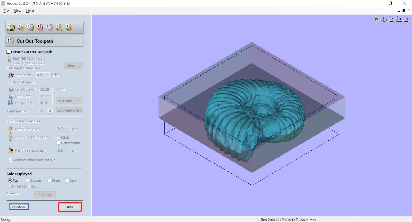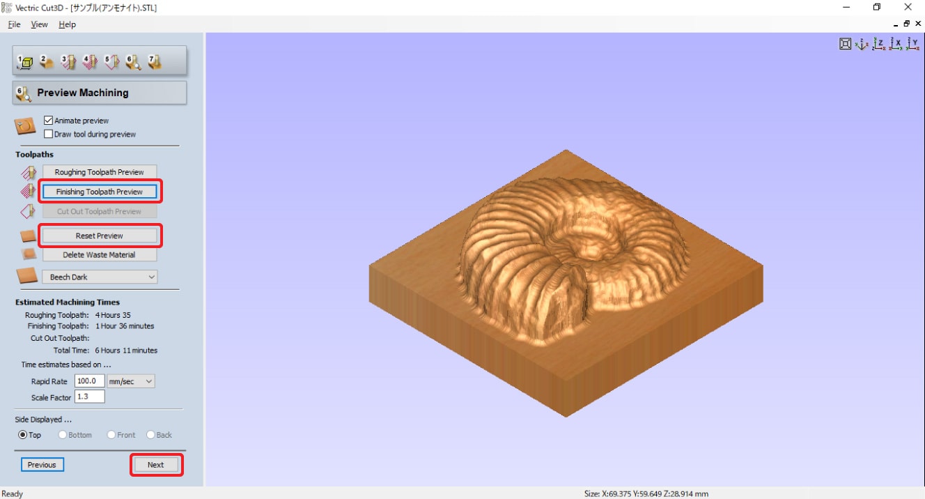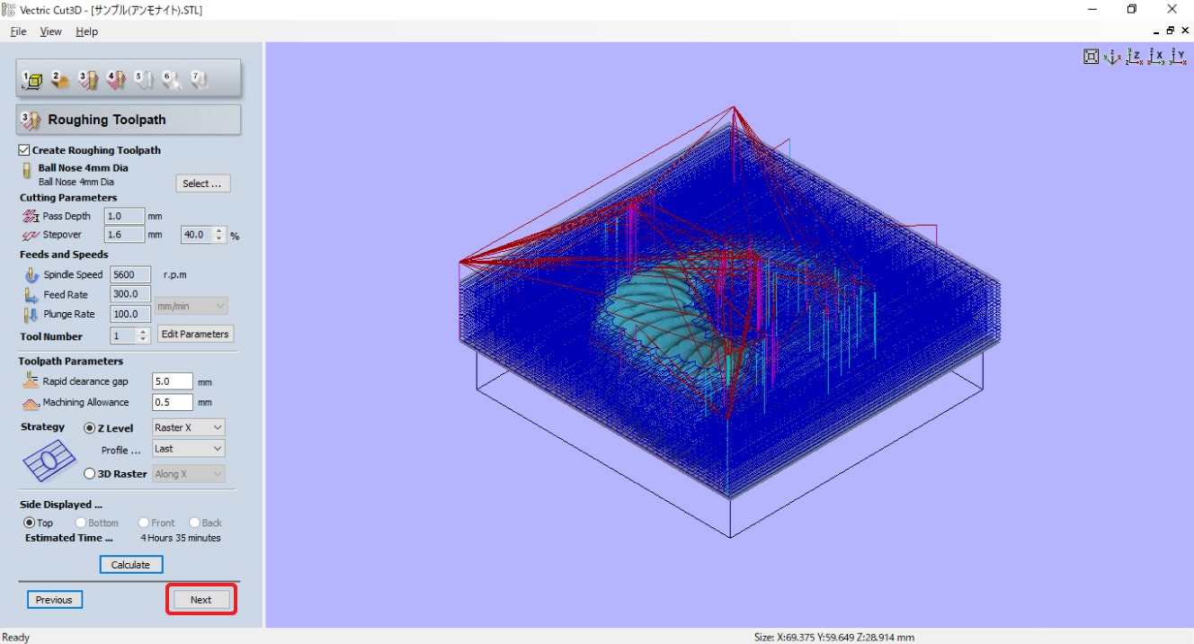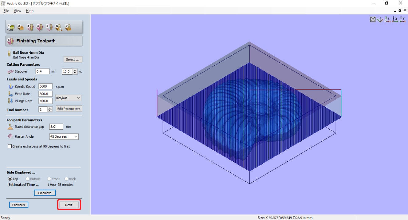 ツールパスが生成されているか確認します。確認後「Next」ボタンをクリックします。
