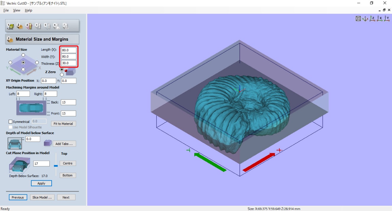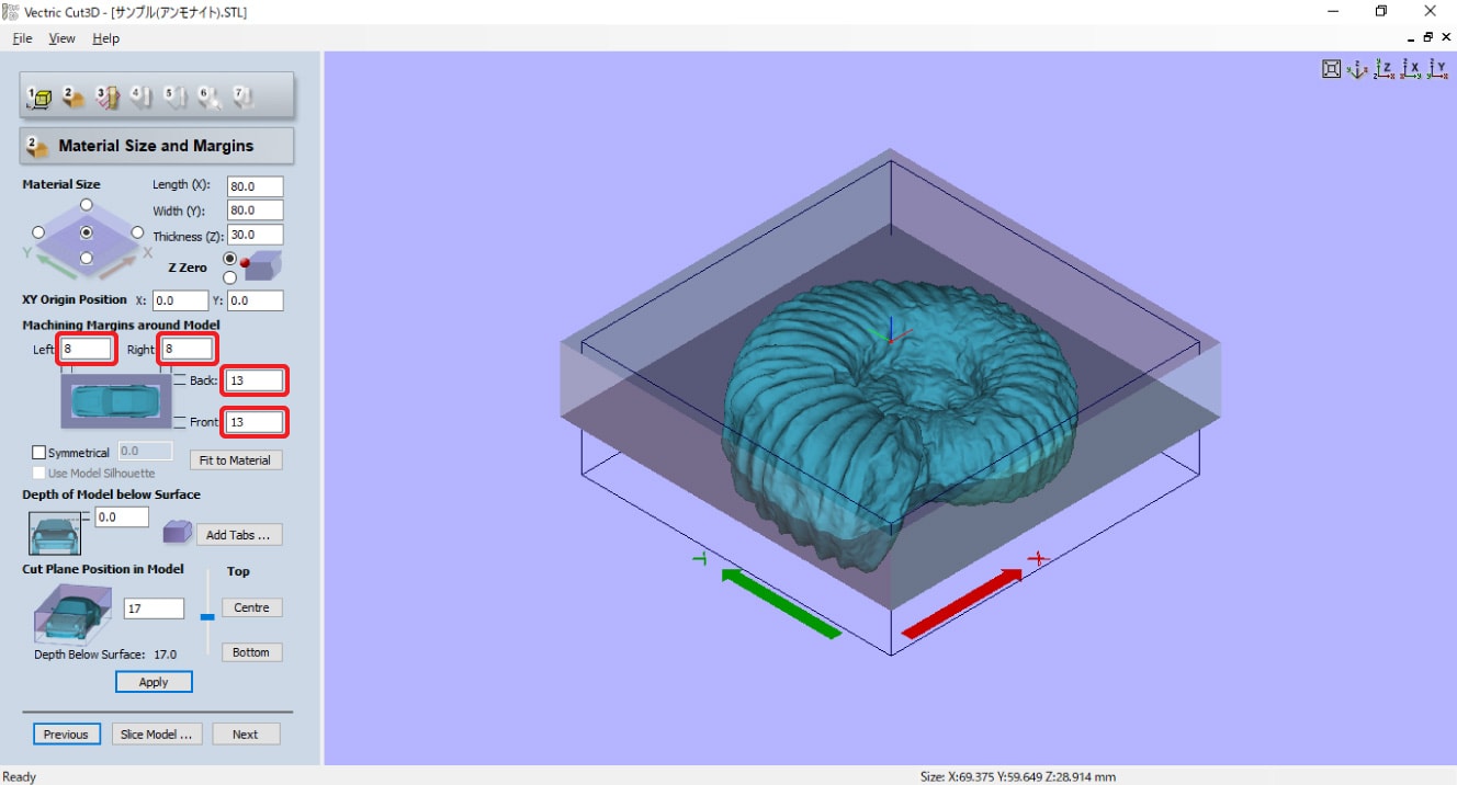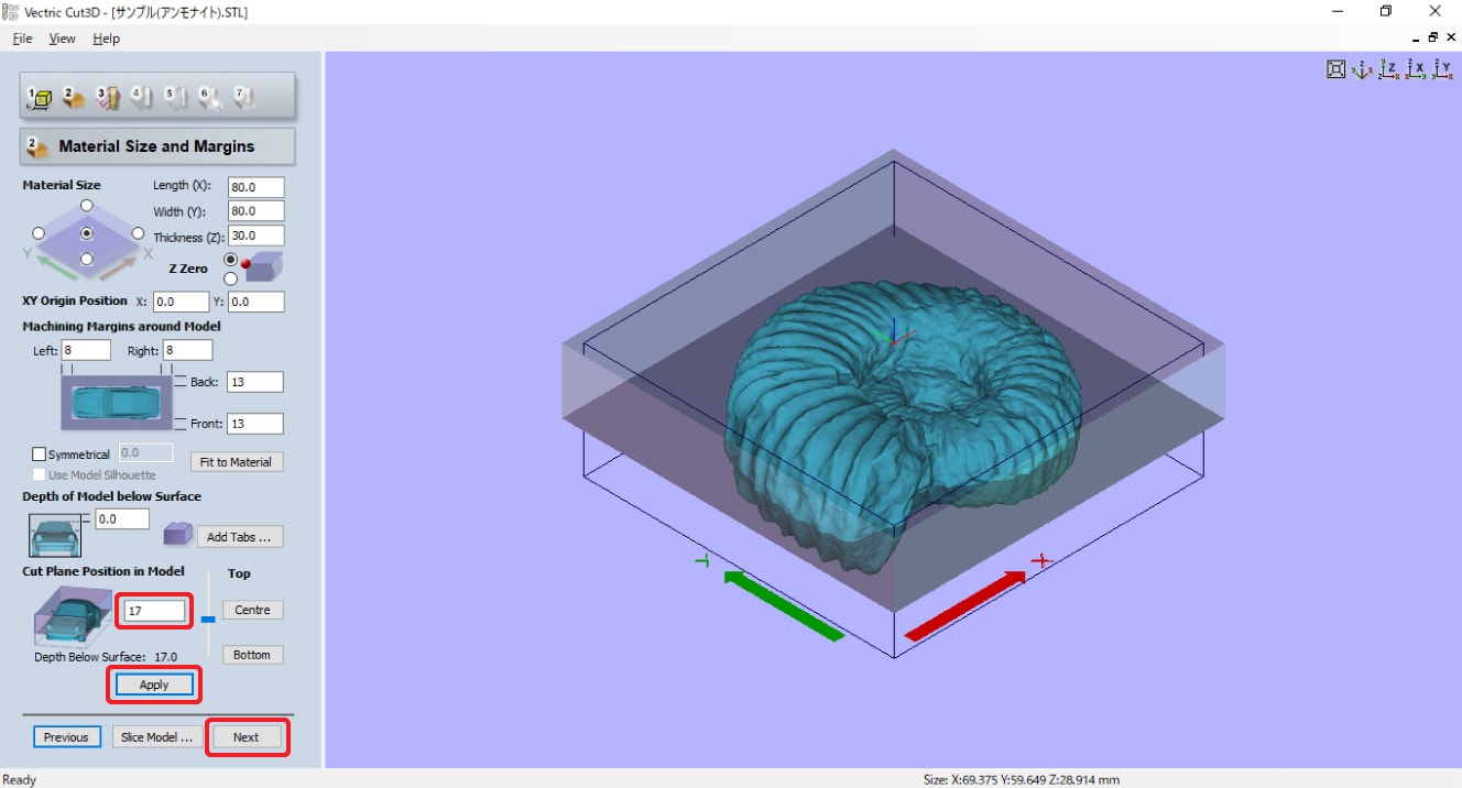 「Cut Plane Position in Model」の項目で最終切削深さの設定を行います。17mmと入力します。
