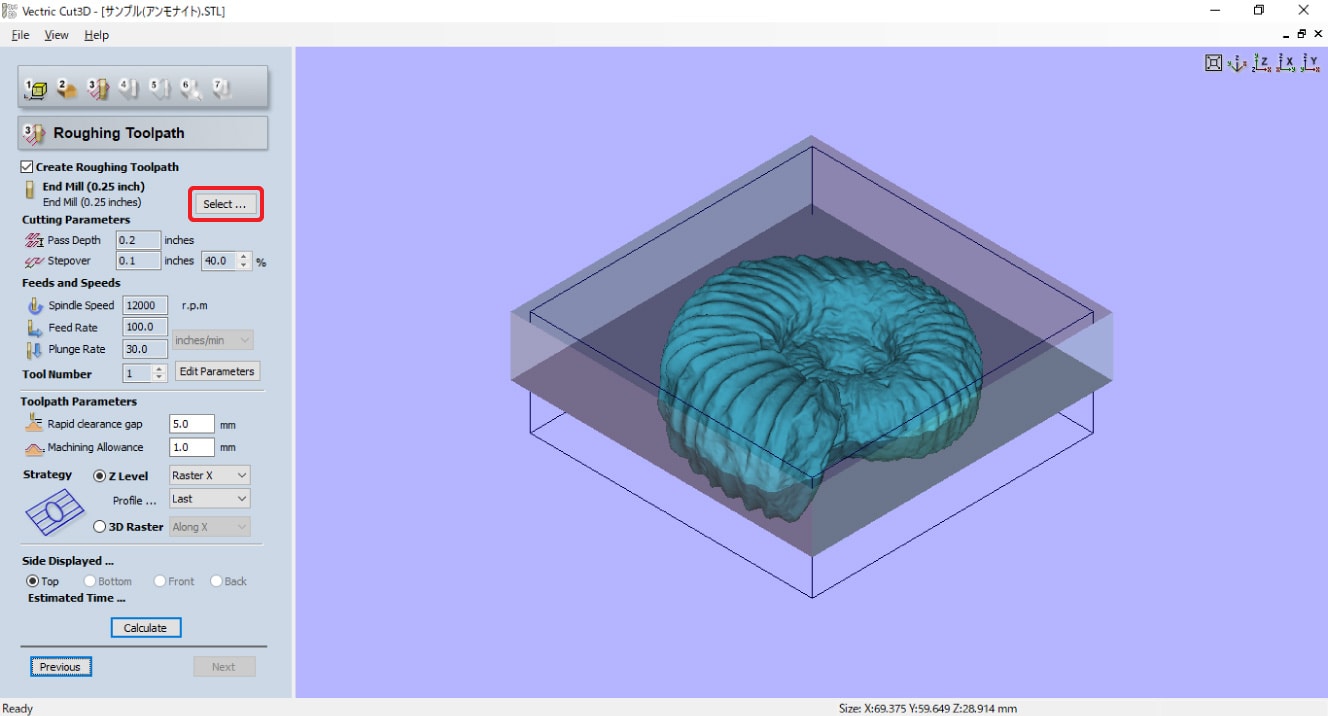 まず先程と同じように「Select」ボタンをクリックしてエンドミルの設定を行います。