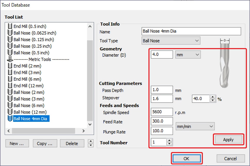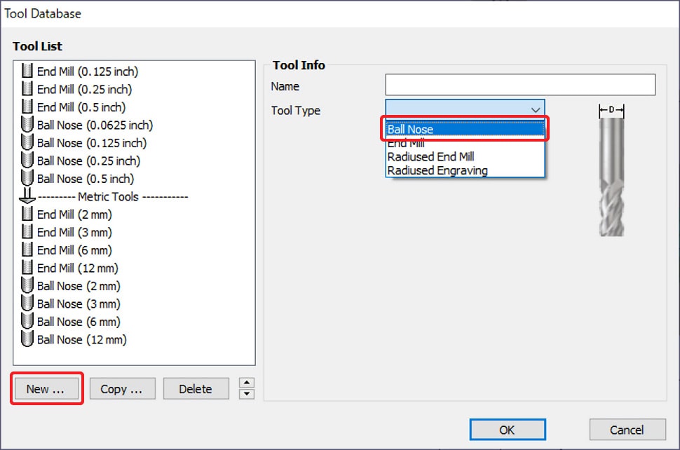 Tool Database画面で「New」ボタンをクリックしてTool TypeはBall Noseを選択します。