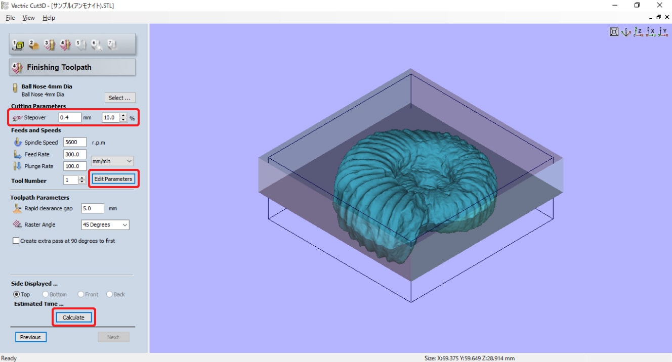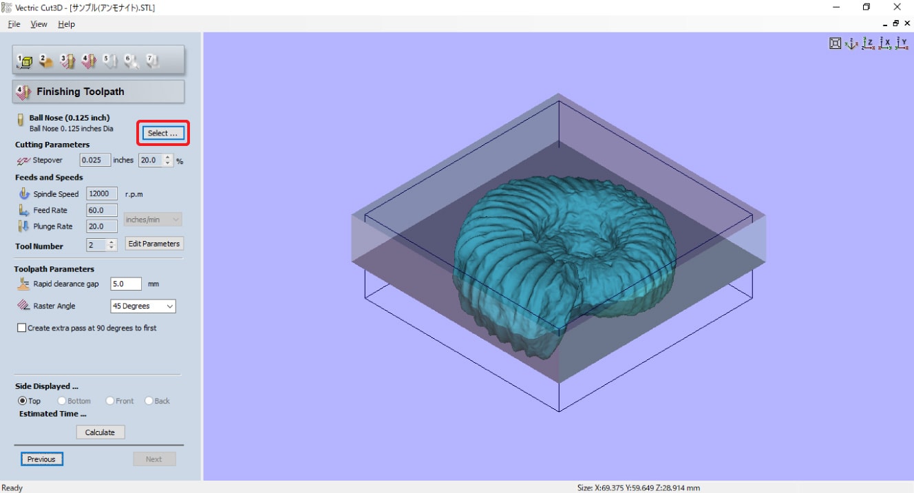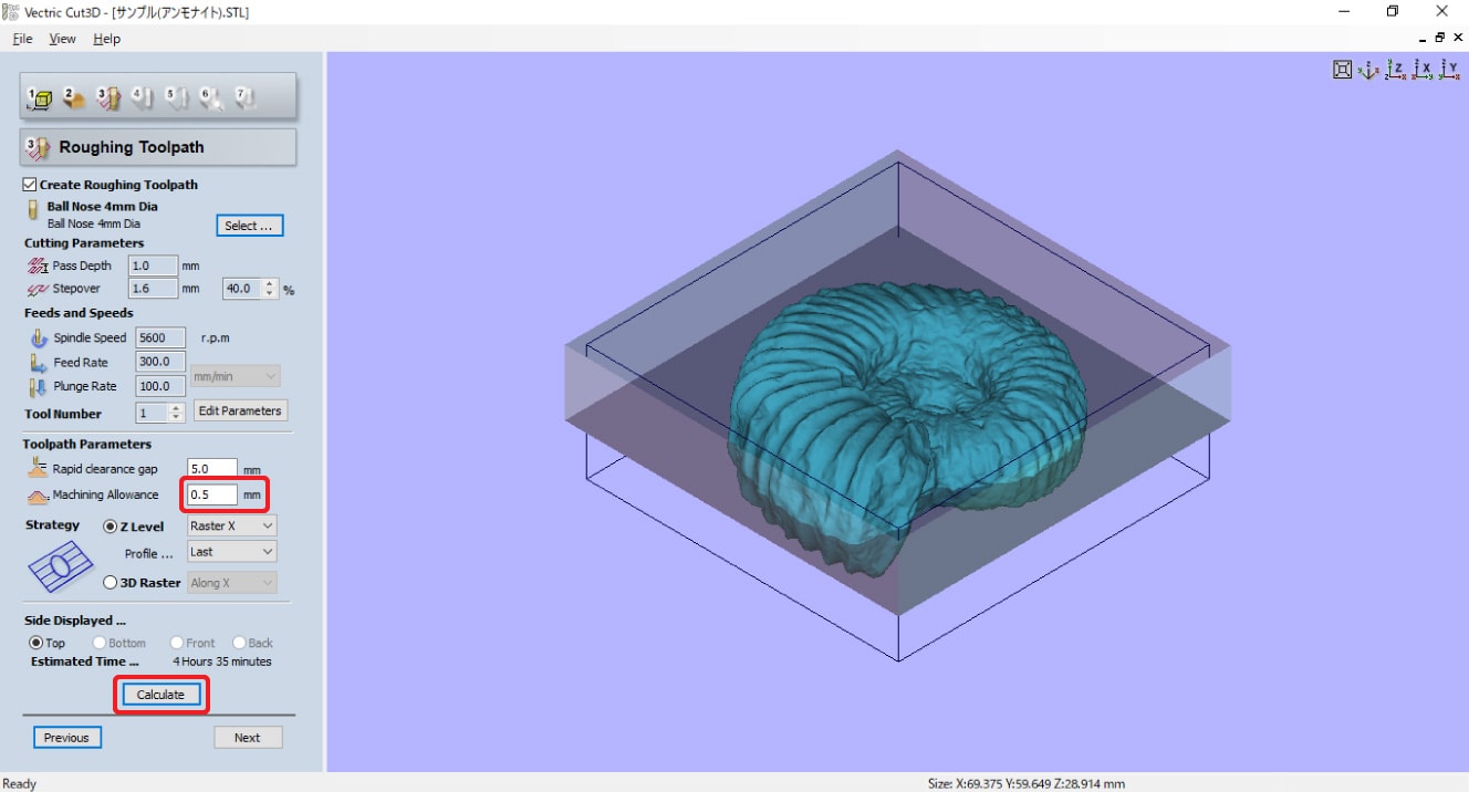 「Calculate」ボタンをクリックして NCプログラムを算出します。算出には時間がかかるのでしばらくお待ちください。