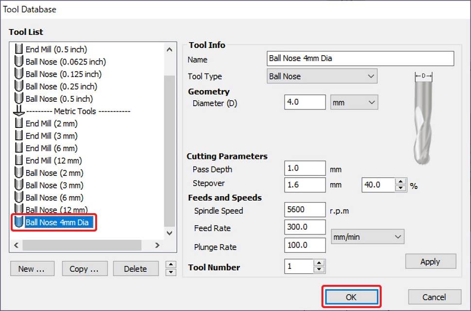 「Tool List」から同じボールエンドミルを選択して、「OK」ボタンをクリックします。