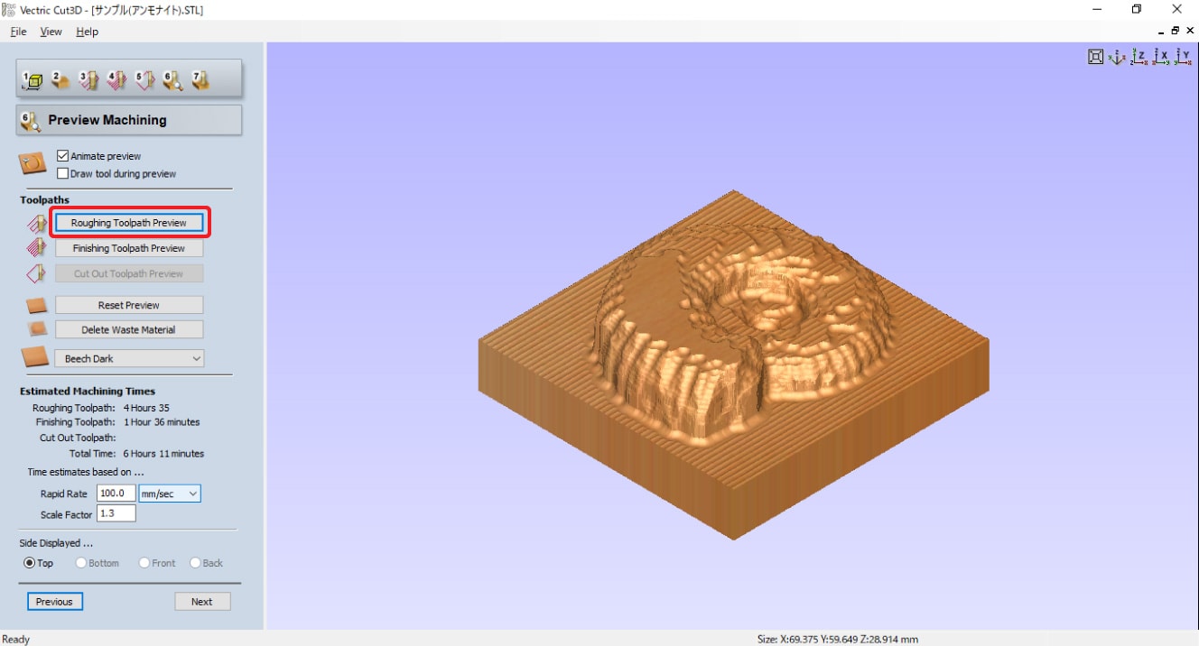 「Finishing Toolpath Preview」ボタンをクリックすると下図のように荒加工のシミュレーションが実行されます。