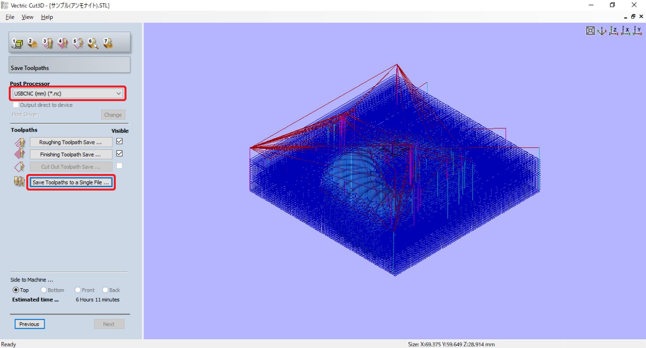最後に「Save Toolpaths to a Single File」ボタンをクリックしNCプログラムを保存すれば完了です。