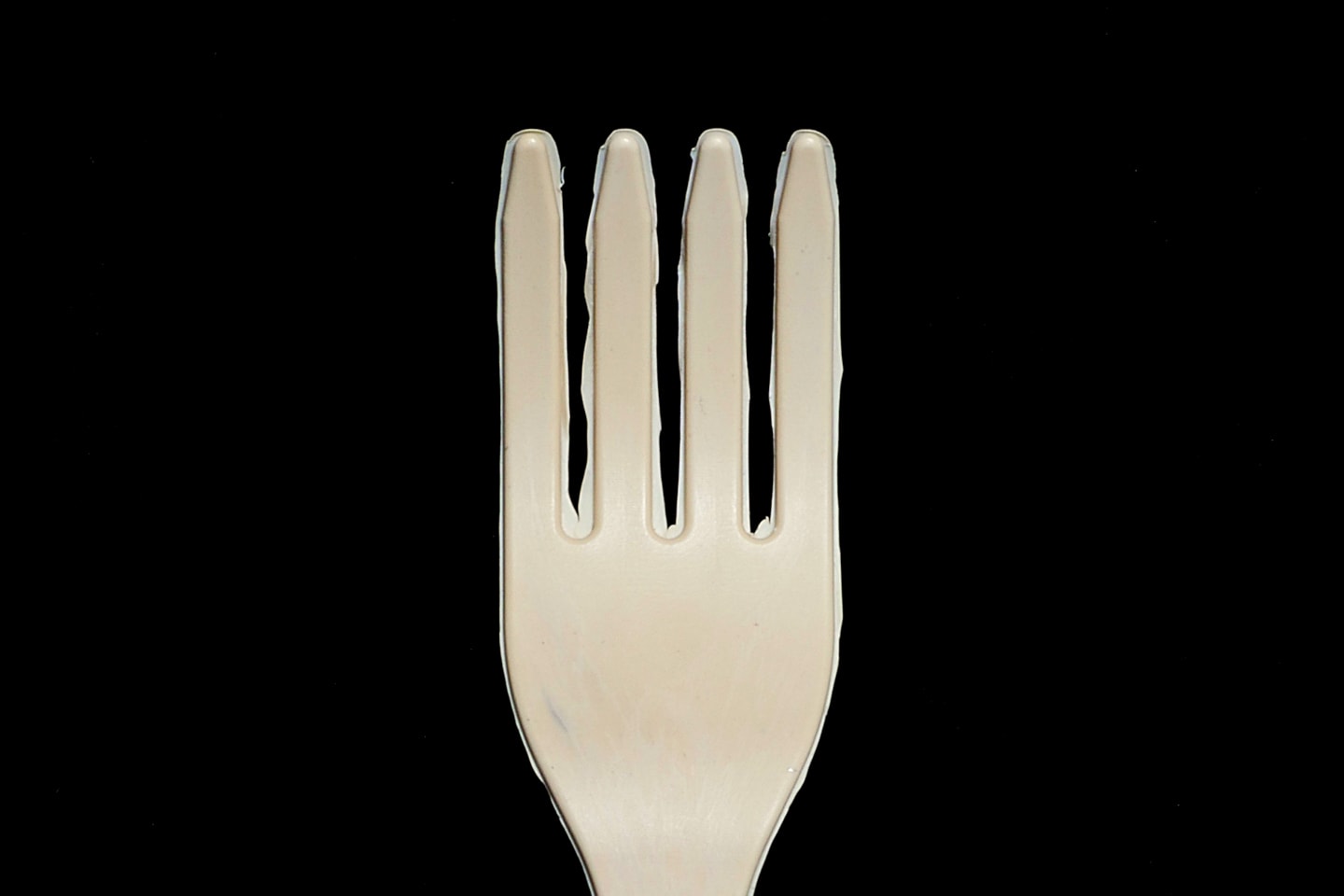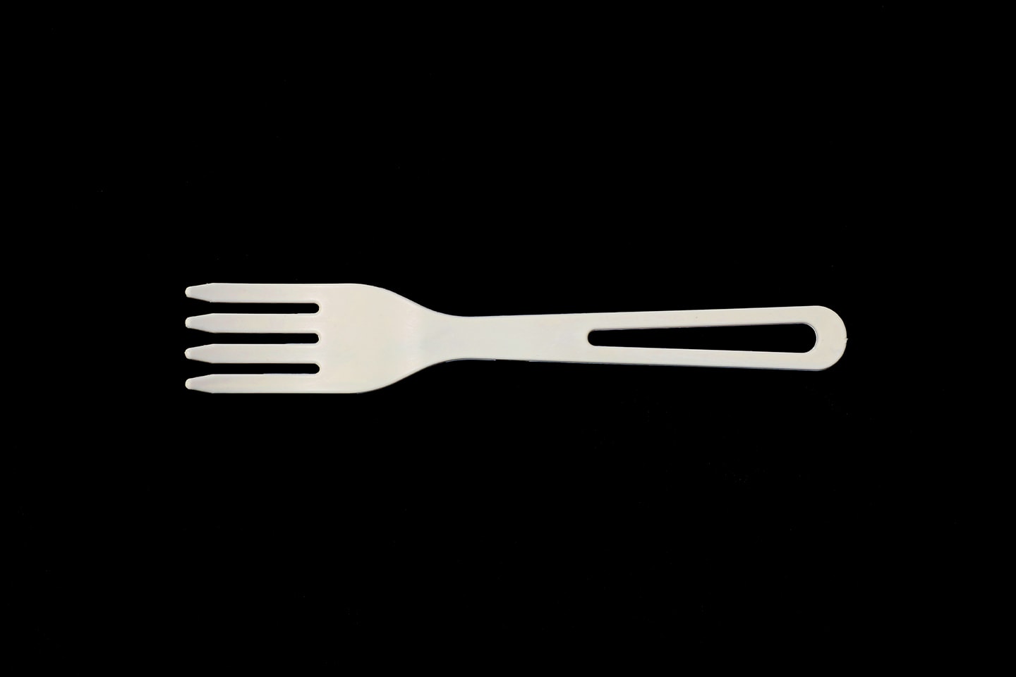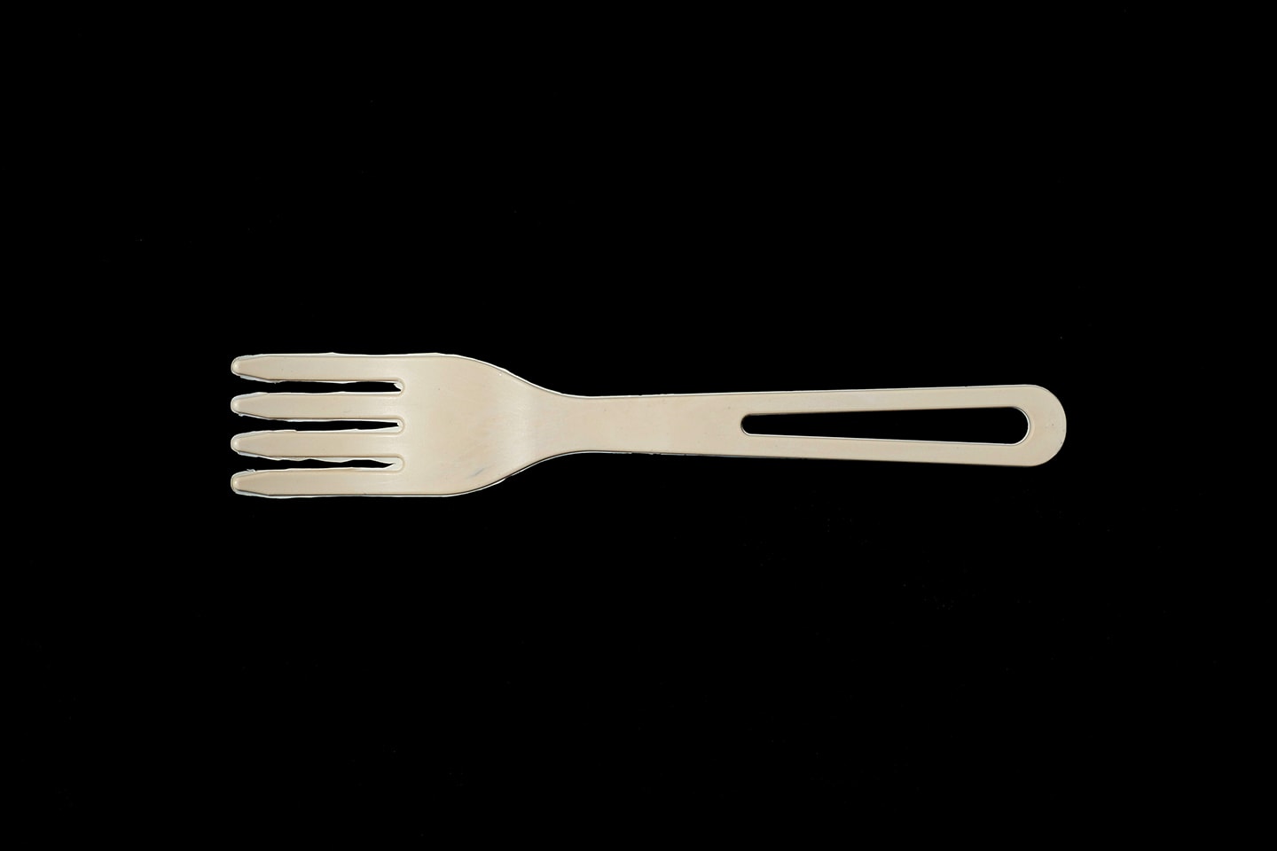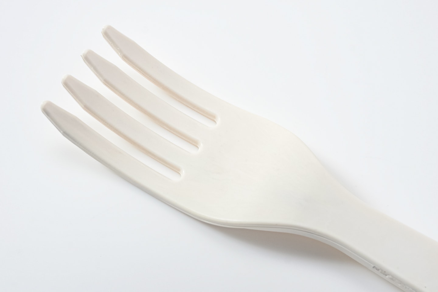 こちらはライスレジンで成形したフォークです。色はお米の乳白色で、手触りはつるつるとしています。