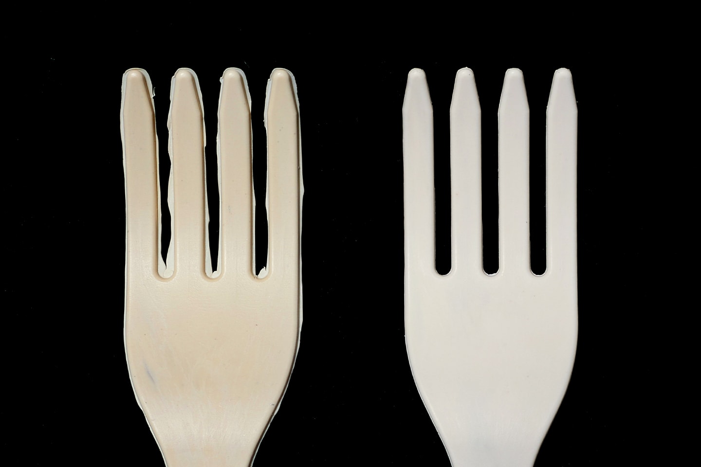 改良前のフォークと比較すると、ほとんどバリのない滑らかな仕上がりで成形されており、焦げたような変色も抑えられていることが確認できます。