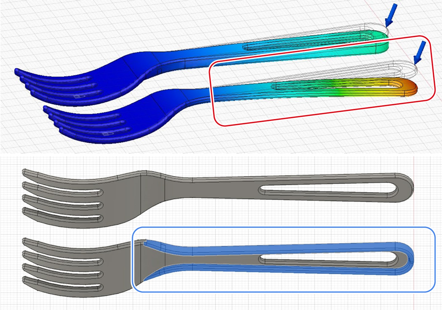 強度が不足していた柄の部分は、外周にリブを設けました。これにより十分な曲げ強度の確保を試みます。次は変色やバリを防ぐために、樹脂の流動性を改良していきます。