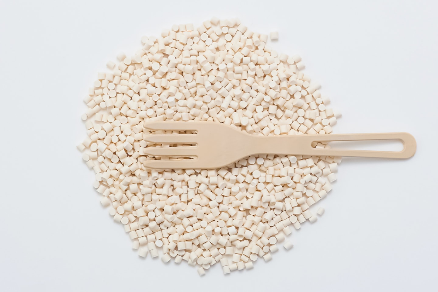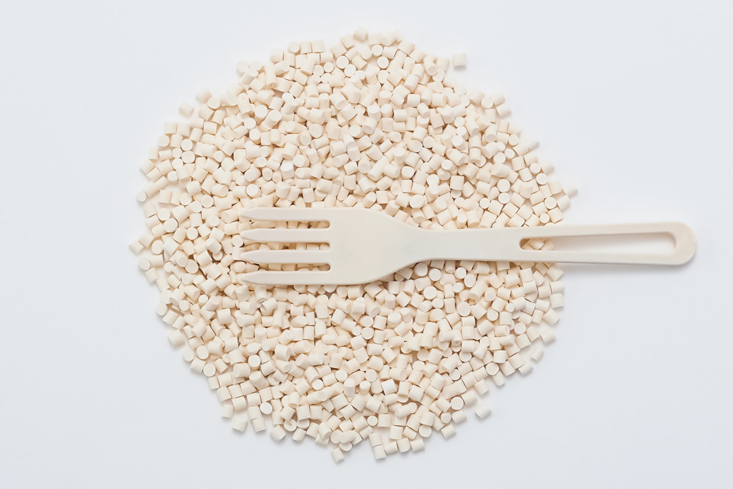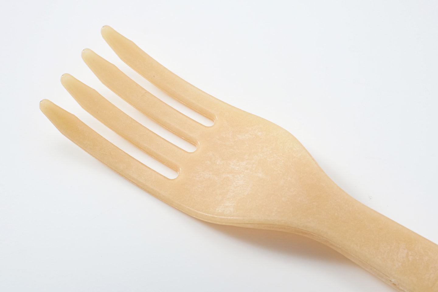 ペレットの状態のライスレジンは白に近い乳白色ですが、成形品のフォークはわずかに茶色がかった色になっており、成形した際に焦げたような変色が生じていることが確認できます。