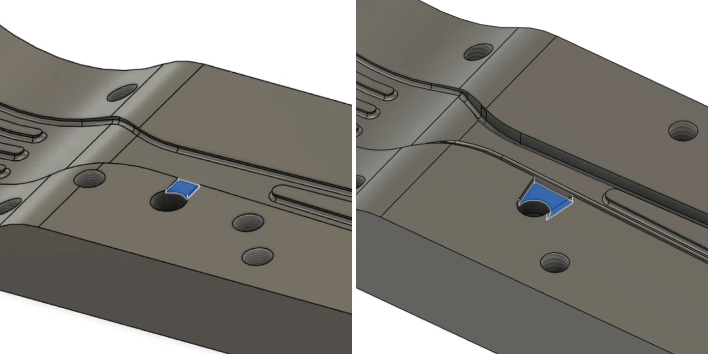 十分な流動性を確保するために、樹脂が流れ込むゲートの形状を改良しました。まず幅を 4mm から 8mm に広げ、樹脂が流れやすくしました。加えて、前回のような角の立った形状のゲートは流れが悪いため、滑らかな形状に修正しました。これにより成形に必要な温度と圧力を試作時よりも低くすることができ、変色やバリの少ない安定した成形が可能になります。