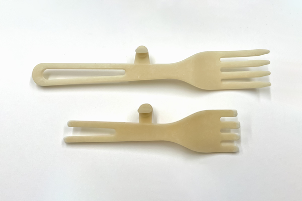 ライスレジンを使用し、「INARI P35」で成形したフォークの試作品です。外観や強度などを確認し、改良すべき点を探っていきます。