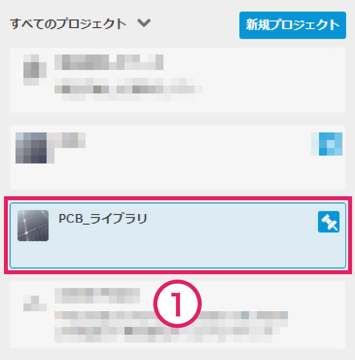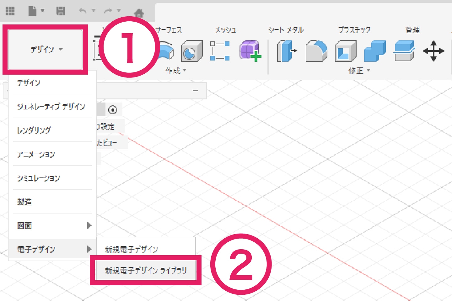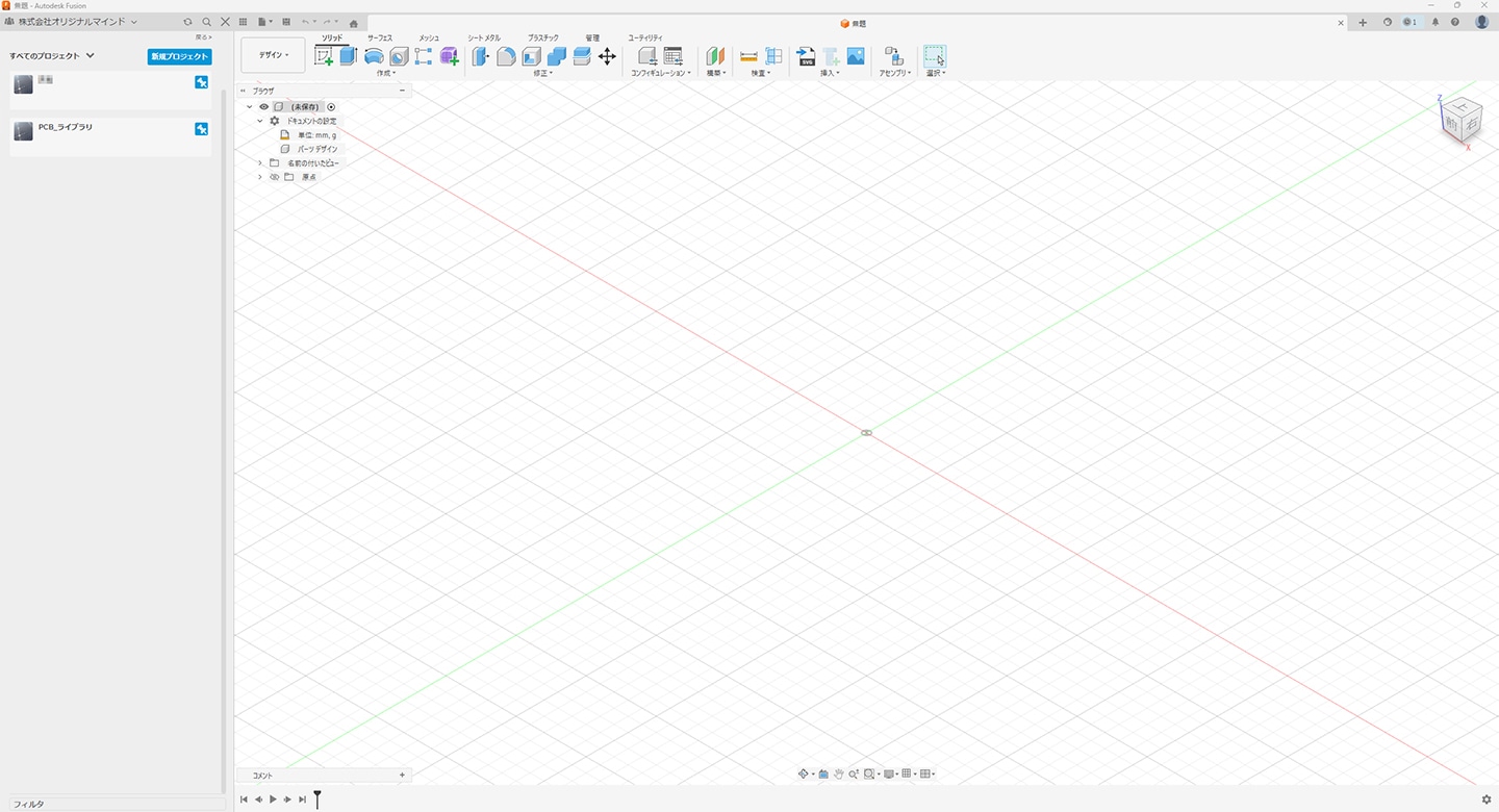 「Fusion」を起動し、これから作成するシンボル、フットプリント、パッケージを保存するためのプロジェクトを作成します。今回は ①「PCB_ライブラリ」というプロジェクトを作成し、② その中にパッケージ保存用として「3D Models」フォルダを作成しました。
