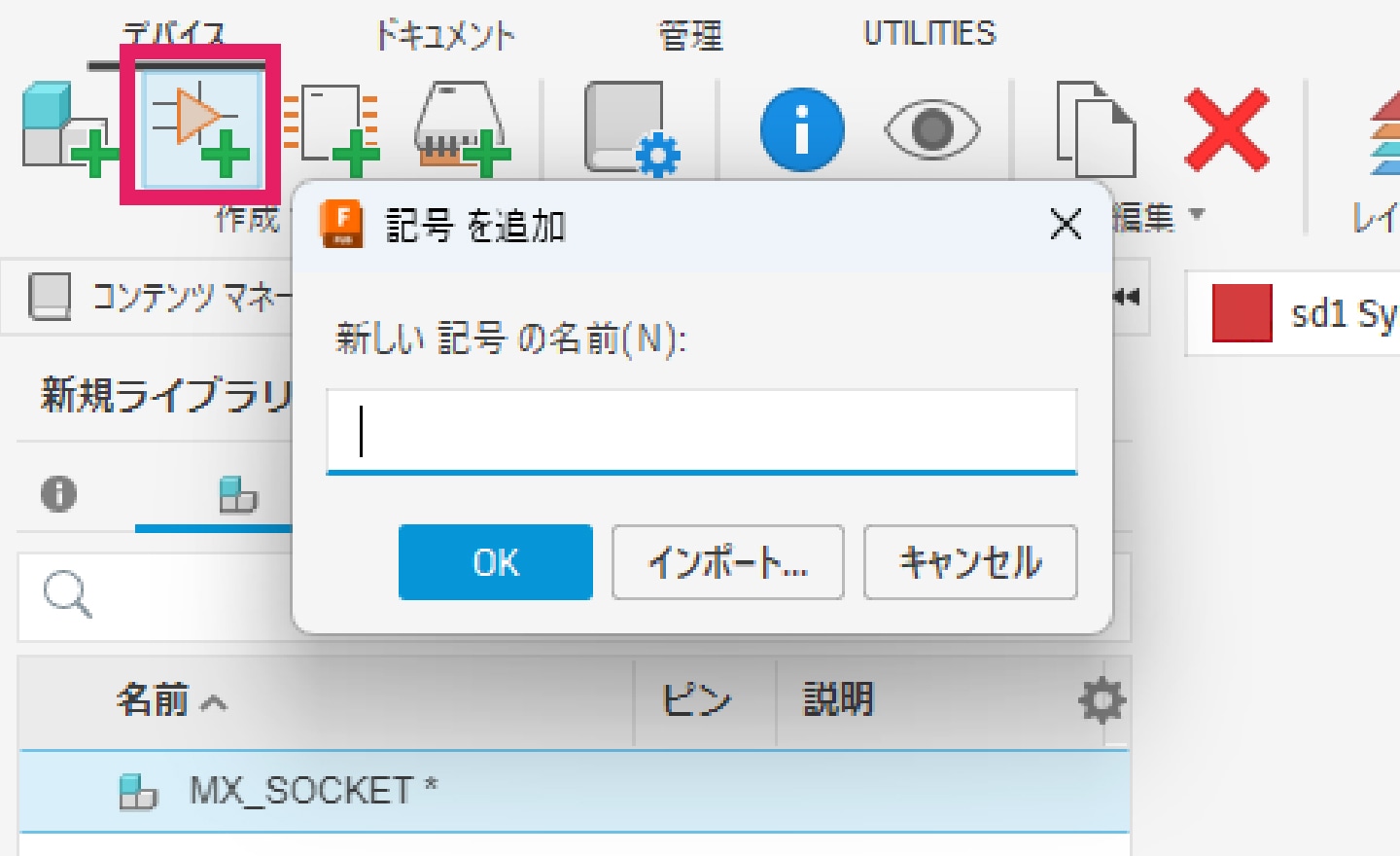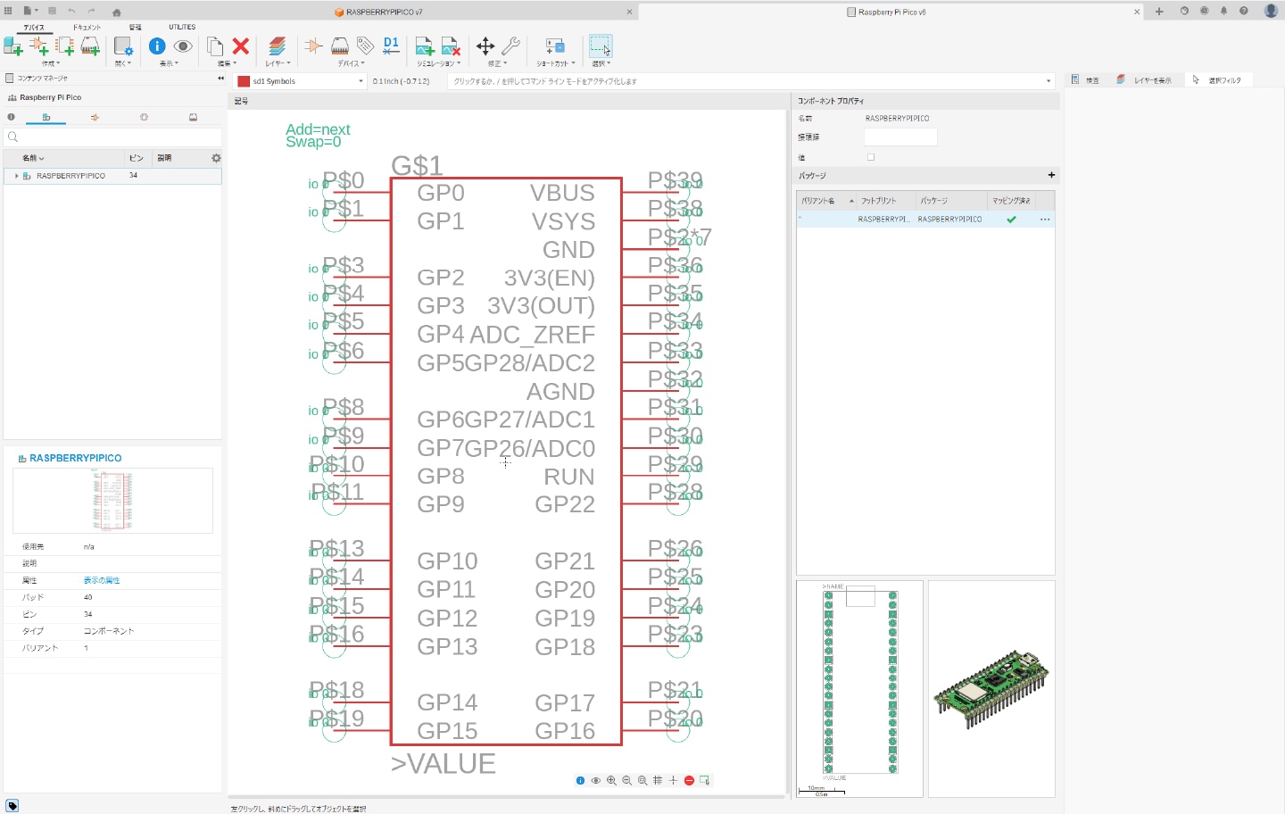画面右側の「コンポーネントを配置」から、作成したライブラリを選択します。作成したライブラリが読み込まれると、下図のように表示されます。その後、表示されたコンポーネントをドラッグ&ドロップすることでシンボルを配置できます。