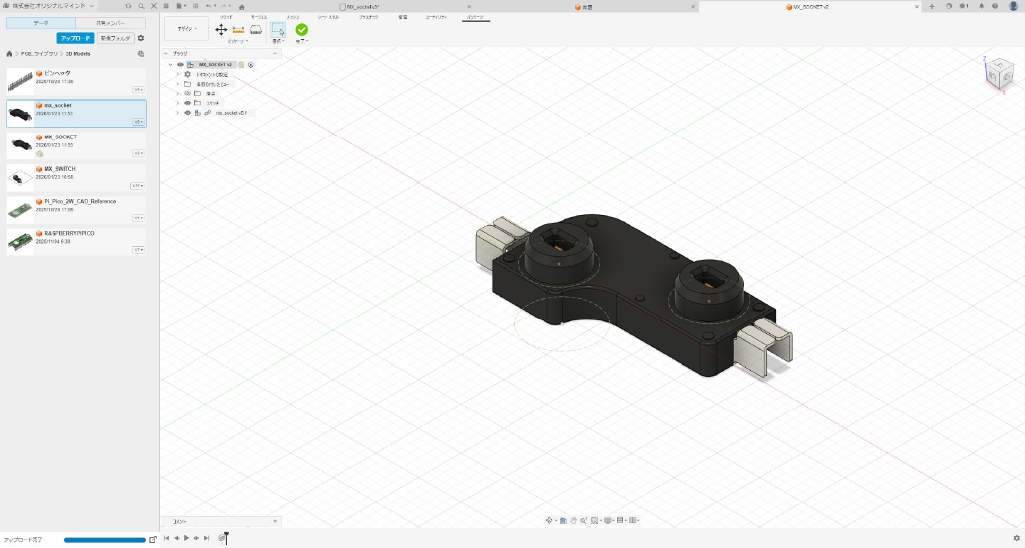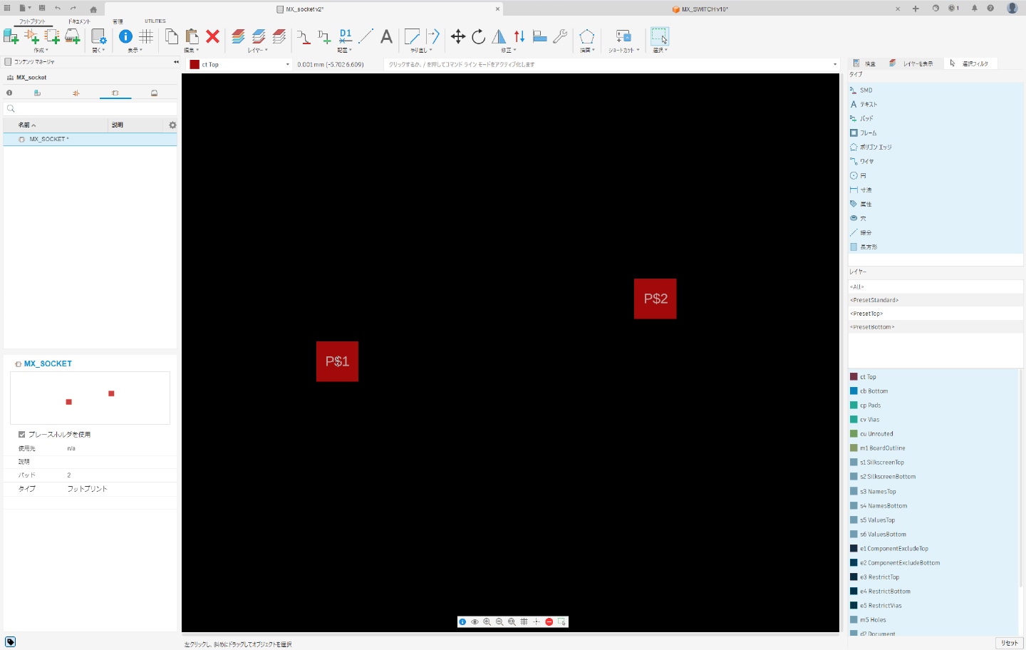 「Fusion」には多くの電子部品が標準ライブラリとして用意されていますが、作成したい基板に使用する部品が、標準ライブラリに含まれていない場合があります。本記事で例として扱うキーボード基板では、以下の部品を自作コンポーネントとして用意しました。