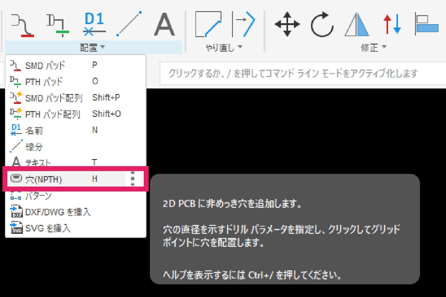 5-3-2|[配置]タブより「穴(NPTH)」コマンドを選択し、ねじ穴などを配置します。