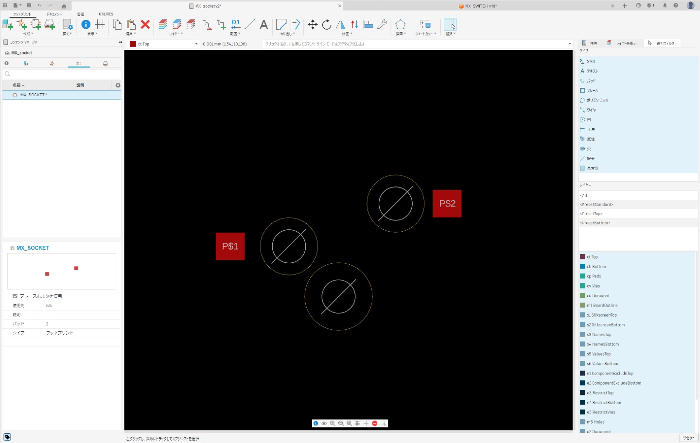 3-3-3|使用するキースイッチとスイッチソケットには底面に突起があるため、[配置]タブより「穴(NPTH)」コマンドを選択し、突起を避けるための穴を追加します。穴を追加したら、フットプリントの作成は完了です。