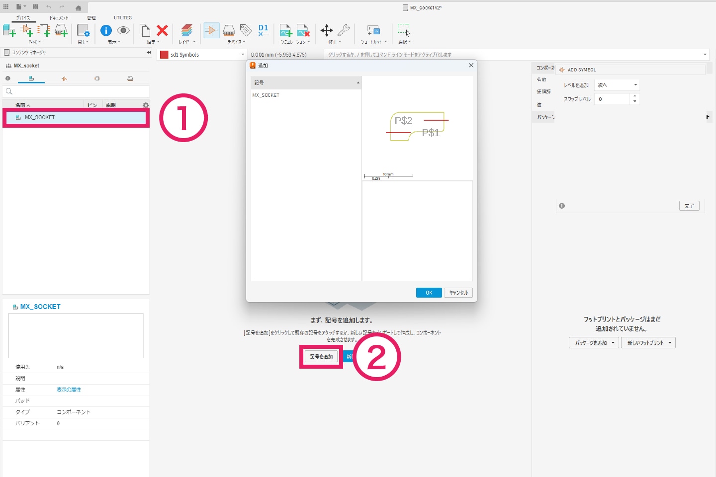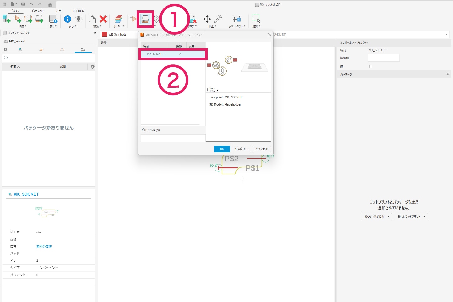 3-4-3|①[デバイス]タブより「Add Package」をクリックし、② 先ほど作成したフットプリントを選択します。