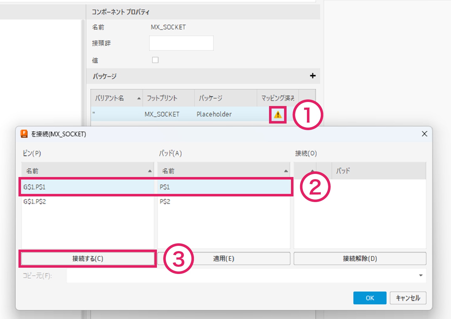 3-4-4|① エラーマークをクリックすると、シンボルのピンとフットプリントのパッドを紐づける画面が表示されます。② 対応するピンとパッドを選択し、③「接続する」をクリックします。