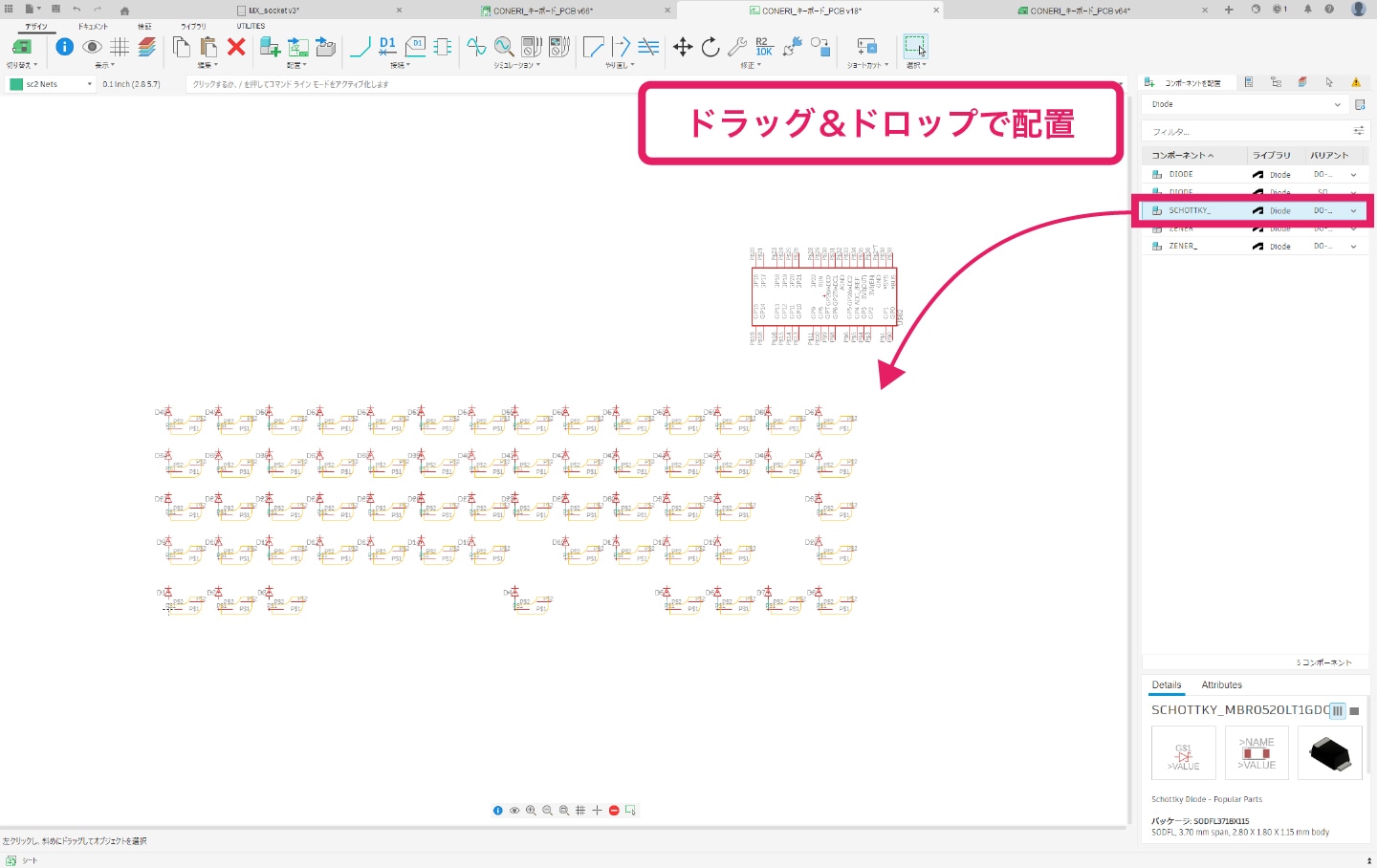表示されたフットプリントを、キーボードの配置に合わせて配置します。