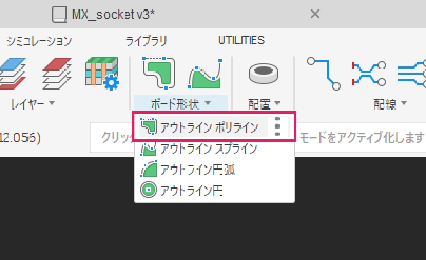 5-3-1|[ボード形状]タブより「アウトライン ポリライン」コマンドを選択し、基板外形を描きます。