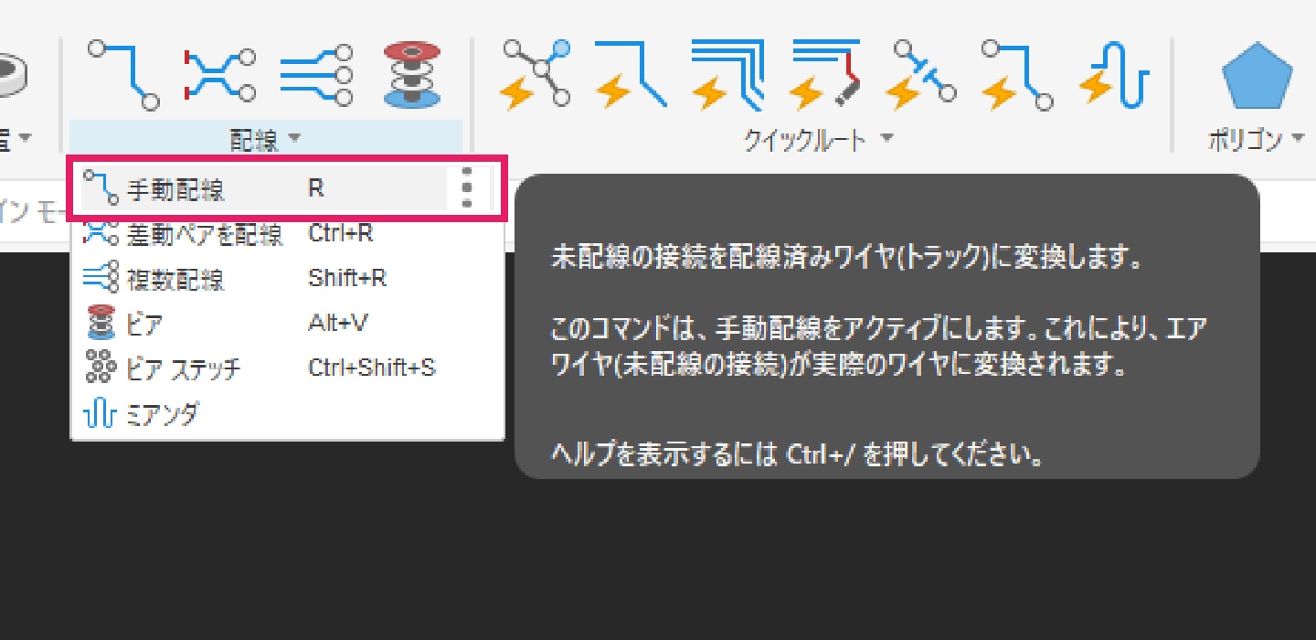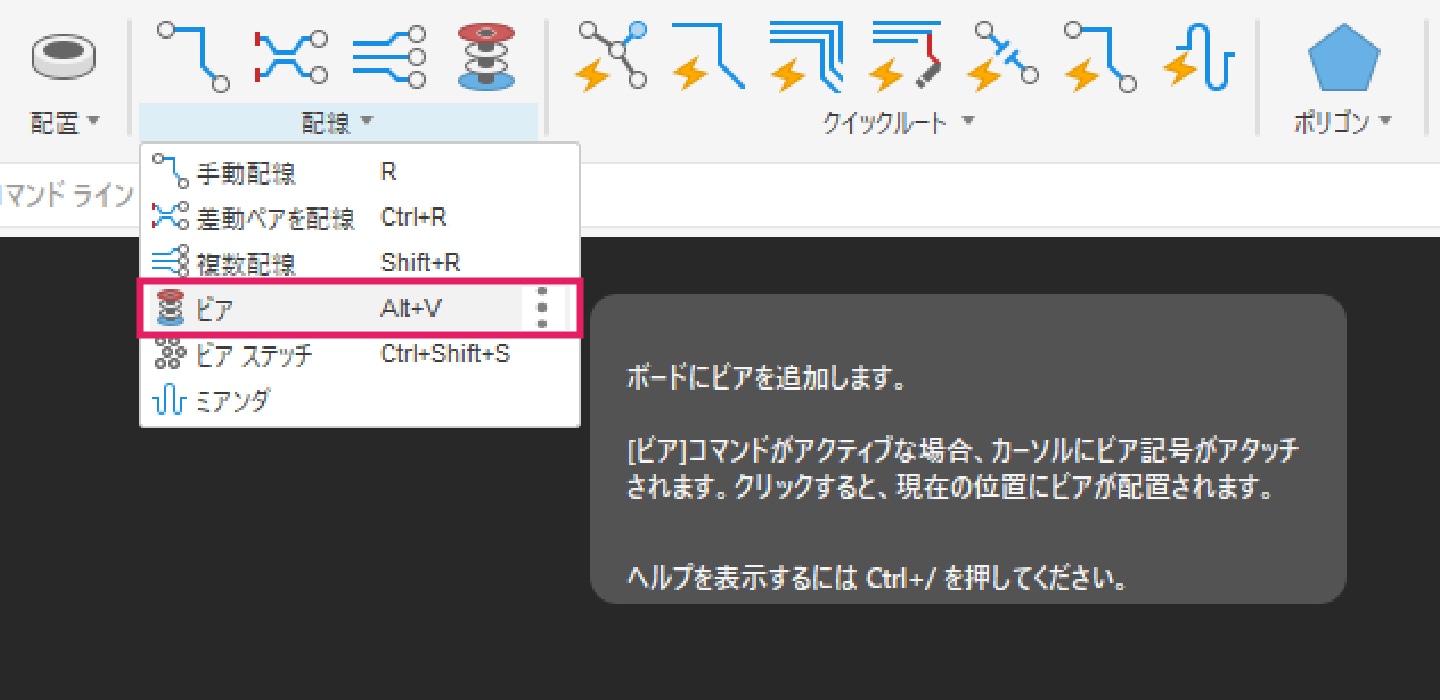 5-4-1|[配線]タブより「ビア」コマンドを選択します。穴径、ビア形状を設定し、信号名を繋ぎたいピンの信号名に合わせて配置します。