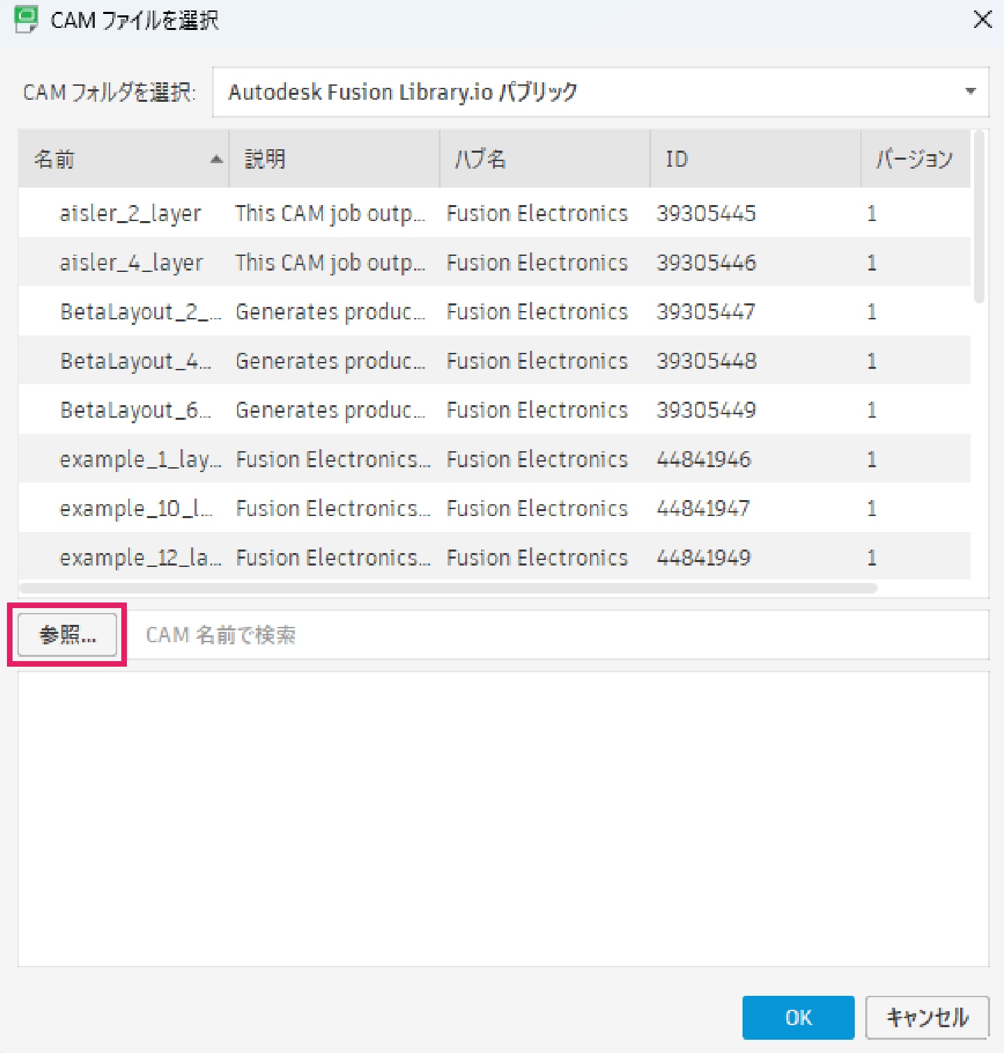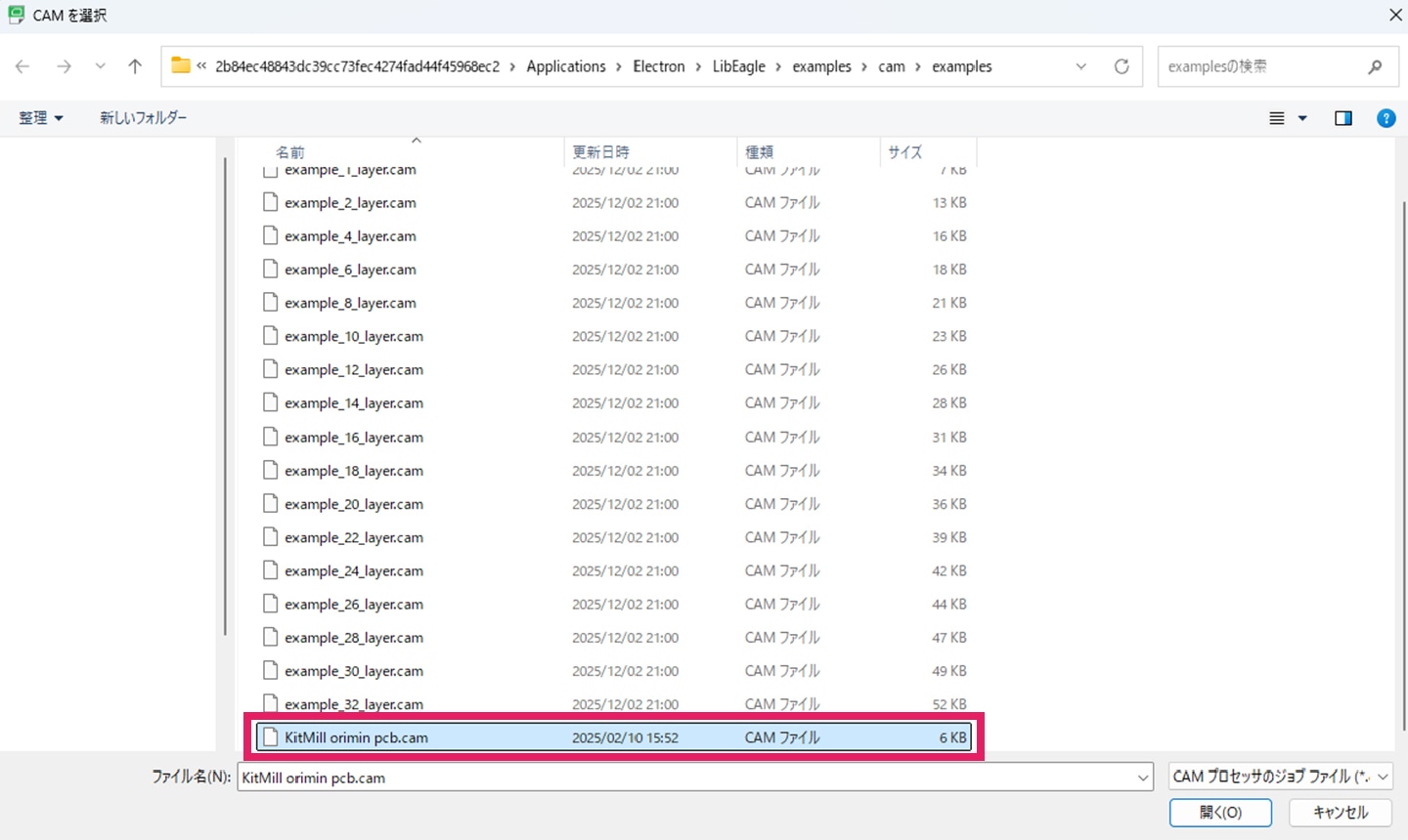 「CAMファイルを選択」ウィンドウ内の「参照」から「KitMill orimin pcb.cam」を開き、適用します。