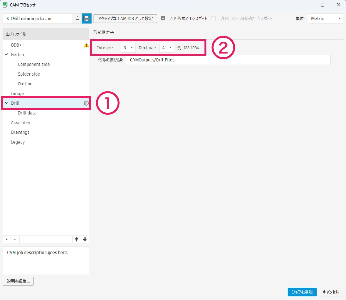 もしドリルの形式指定子を変更したい場合は、①「出力ファイル」内の「Drill」を選択し、② 「Integer:3」、「Decimal:4」 となっている数値を変更してください。