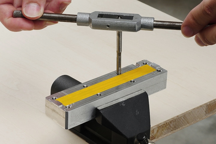 「KitMill AST200」で加工した下穴にタップを垂直に立て、ハンドルを押し付けるように回していきます。この操作によりタップが材料を切削し、内部ねじが作られます。回転が重くなってきたら逆側に回して切りくずを捨てます。これを繰り返して全てのネジ穴を加工します。