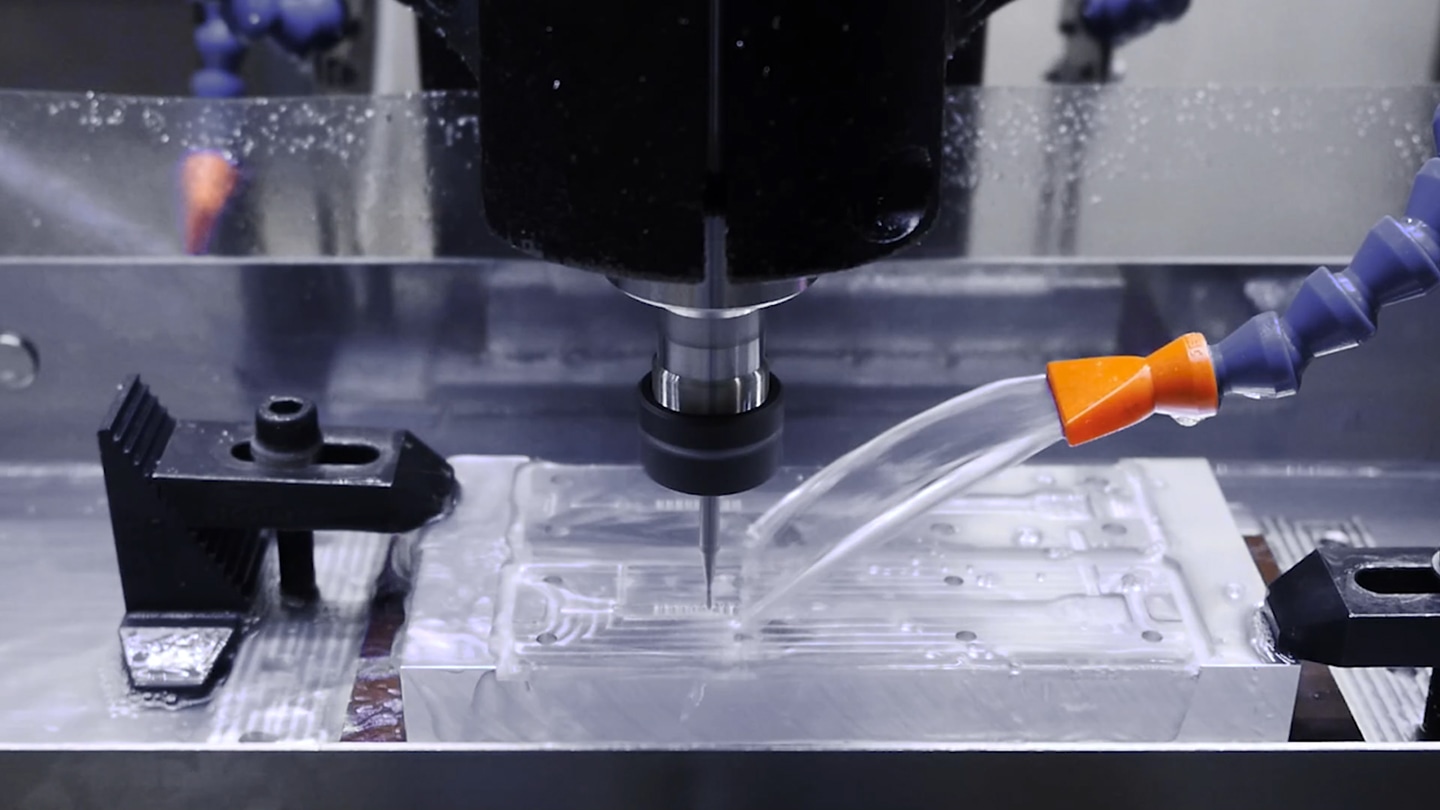 切削用NC用プログラムを使用して金型の切削を行います。今回は「KitMill AST200」と「クーラントケース」を使用しました。クーラントが切削中に発生する切りくずを排出し、高精度な金型に仕上げることができます。
