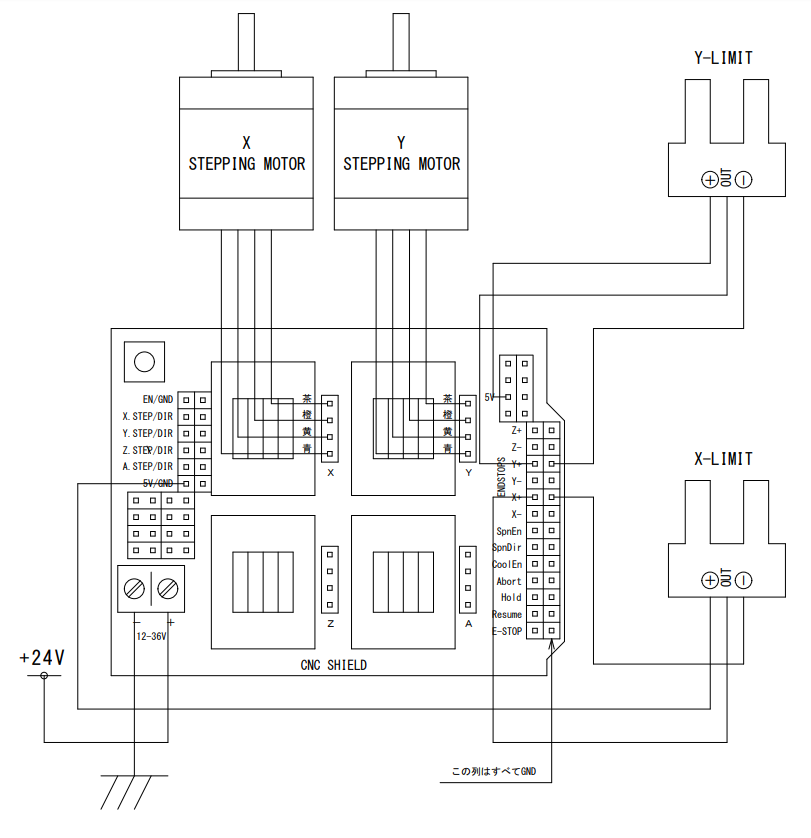 ※今回、各リミットセンサ(フォトマイクロセンサ)の(+)は、差し込むだけでご利用いただけるようにCNCシールド基板の5Vに接続するようにしましたが、付属のフォトマイクロセンサはDC5~24Vで動作するため、24Vに接続していただいても構いません。