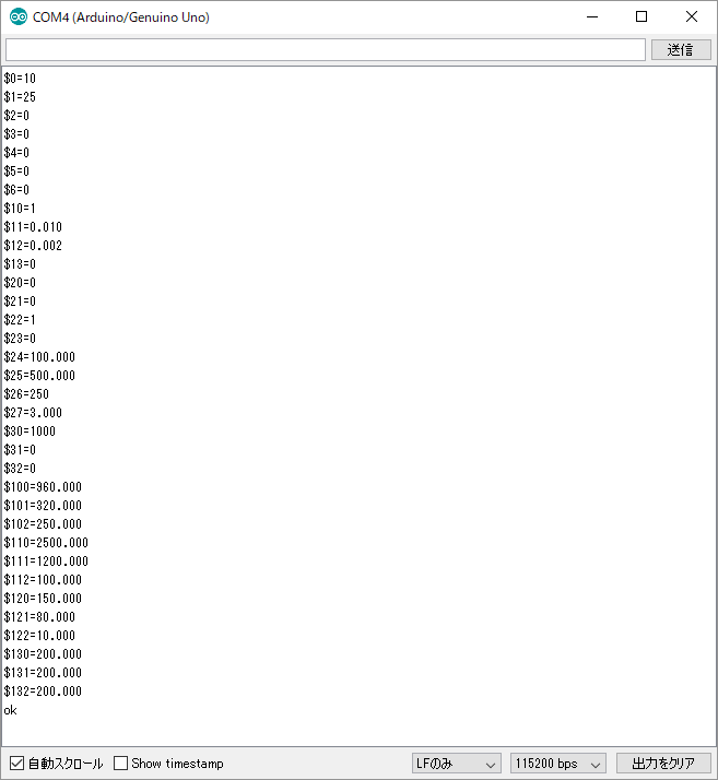 下記は本製品を使う場合のArduinoの設定例です。下記の通りに設定しますと、実際のアクチュエータの移動量とgrblに表示される移動量が一致します。ただし、Arduino基板のマイクロステップの設定は1/16としています。マイクロステップの設定のしかたについては、こちらをご覧ください。)